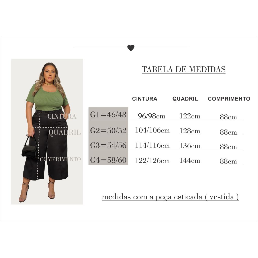 Pantacourt feminina plus size alfaiataria! Detalhe de elástico no cós traseiro que veste melhor a cintura e proporciona um ótimo caimento! medidas: (G1 = 46/48) cintura 96/98cm, quadril 122cm, comprimento 88cm (G2 = 50/52) cintura 104/106cm, quadril 128cm, comprimento 88cm (G3 = 54/56) cintura 114/116cm, quadril 136cm, comprimento 88cm (G4 = 58/60) cintura 122/126cm, quadril 144cm, comprimento 88cm PRODUTOS ORIGINAIS E TOTALMENTE CONFIÁVEIS. SOMOS UMA EMPRESA QUE PREZA PELA QUALIDADE E ESTILO E CONFIANÇA, VENDEMOS PRODUTOS CONFIAVEIS EXATAMENTE IGUAL A FOTO DO ANÚNCIO!