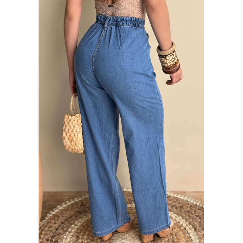 PANTALONA CALÇA FEMININA WIDE LEG JEANS CLARA CINTURA ALTA COM ELÁSTICO NA CINTURA