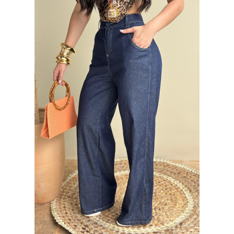 PANTALONA CALÇA FEMININA WIDE LEG JEANS ESCURO CINTURA ALTA COM ELASTICO E COS