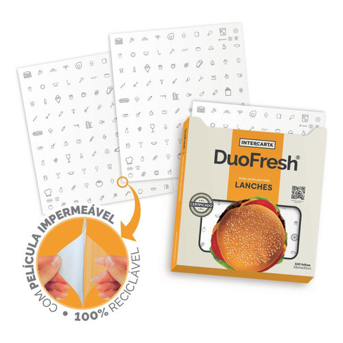 O Papel Acoplado DuoFresh® Lanches (Food) é ideal para embalar hambúrgueres, lanches e sanduíches. Aumente a percepção de qualidade entre seus clientes, que se sentirão presenteados ao receber os alimentos embalados no DuoFresh® Lanches (Food). Desenvolvido especialmente para atender lanchonetes, hamburguerias, food-trucks, restaurantes, padarias e cozinhas gourmet. O Papel Acoplado DuoFresh® é a solução inovadora da Intercarta® que usa a exclusiva tecnologia do papel acoplado para proteger e conservar os alimentos frescos e saborosos por mais tempo, sendo 100% reciclável. O Papel Acoplado DuoFresh® produzido pela Intercarta® é constituído de uma película de polietileno de alta densidade, acoplada a uma folha de papel (celulose virgem, sem adição de alvejante óptico), garantindo máxima segurança, qualidade, integridade e frescor aos alimentos. Com desempenho superior a embalagens como papel manteiga, papel seda e papel barreira. Fabricante: Intercarta. Aplicações sugeridas: Embalar hambúrguer, sanduíche, pizza em pedaços, hotdog, kebab e diversos tipos de lanches. Quantidade: 500 folhas. Composição: Papel Monolúcido 25gr/m2, Filme de Polietileno de Alta Densidade, Cola PVA e Tinta Base Água. Medidas: 33 x 37 cm. Sobre a Intercarta A Intercarta é pioneira em papel acoplado no Brasil e líder no segmento há mais de 30 anos! São mais de 500 milhões de unidades de DuoFresh® vendidas por ano e para manter essa posição, nós investimos constantemente em maquinários, processos e pessoas. Com infraestrutura, solidez, práticas de inovação e alta capacidade produtiva, a Intercarta® fornece ótimos níveis de serviço, resultando em entregas mais ágeis dos pedidos aos clientes.