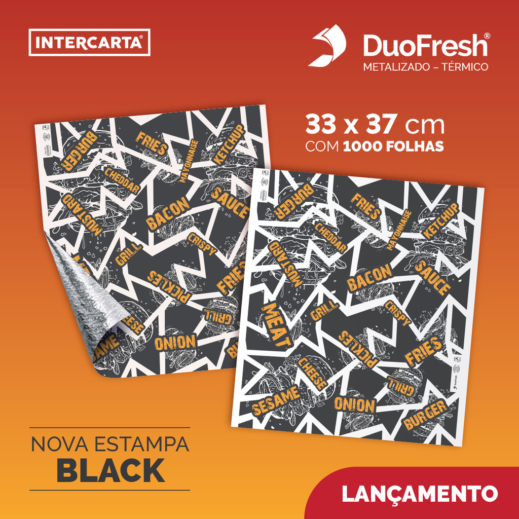 Descrição do Produto: Dê um upgrade na apresentação dos seus lanches com a nova estampa BLACK do DuoFresh Térmico Metalizado! Inspirada nas tendências atuais, essa estampa traz um visual moderno e urbano que valoriza ainda mais o seu hambúrguer e deixa sua marca na frente da concorrência. O DuoFresh Térmico Metalizado é a embalagem que une estilo e funcionalidade: - Mantém o lanche quente por mais tempo – ideal para delivery. - Protege o alimento com total segurança e qualidade. - Produto próprio para contato direto com alimentos, aprovado para uso seguro. - 100% reciclável, substitui embalagens ultrapassadas como o isopor. - Com ele, sua hamburgueria, lanchonete ou food truck conquista mais clientes e transmite a sensação de cuidado e qualidade em cada pedido. Especificações Técnicas: - Quantidade: 1000 folhas - Medida: 33 x 37 cm - Composição: Papel Monolúcido 25g/m², Filme BOPP Metalizado, Cola PVA e Tinta Base Água - Aplicações: hambúrgueres, sanduíches, hot dog, kebab, pizza em pedaços e diversos tipos de lanches - Fabricante: Intercarta - Marco/Produto: DuoFresh Sobre o DuoFresh e a Intercarta: A Intercarta é pioneira em papel acoplado no Brasil, líder há mais de 30 anos e responsável por mais de 700 milhões de unidades vendidas ao ano. O DuoFresh é nosso produto exclusivo, desenvolvido para unir conservação, praticidade e inovação.