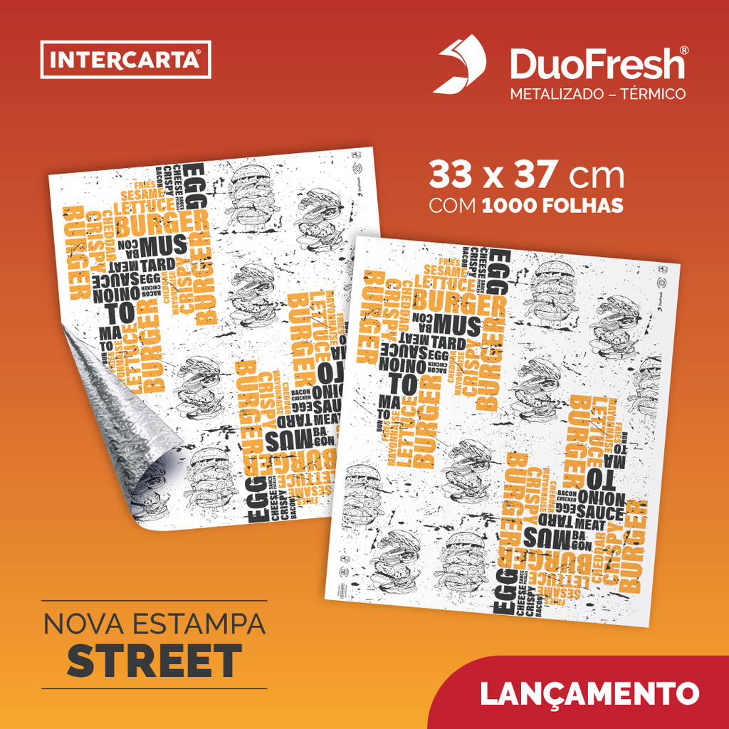 Descrição do Produto: Dê um upgrade na apresentação dos seus lanches com a nova estampa STREET do DuoFresh Térmico Metalizado! Inspirada nas tendências atuais, essa estampa traz um visual moderno e urbano que valoriza ainda mais o seu hambúrguer e deixa sua marca na frente da concorrência. O DuoFresh Térmico Metalizado é a embalagem que une estilo e funcionalidade: - Mantém o lanche quente por mais tempo – ideal para delivery. - Protege o alimento com total segurança e qualidade. - Produto próprio para contato direto com alimentos, aprovado para uso seguro. - 100% reciclável, substitui embalagens ultrapassadas como o isopor. - Com ele, sua hamburgueria, lanchonete ou food truck conquista mais clientes e transmite a sensação de cuidado e qualidade em cada pedido. Especificações Técnicas: - Quantidade: 1000 folhas - Medida: 33 x 37 cm - Composição: Papel Monolúcido 25g/m², Filme BOPP Metalizado, Cola PVA e Tinta Base Água - Aplicações: hambúrgueres, sanduíches, hot dog, kebab, pizza em pedaços e diversos tipos de lanches - Fabricante: Intercarta - Marco/Produto: DuoFresh Sobre o DuoFresh e a Intercarta: A Intercarta é pioneira em papel acoplado no Brasil, líder há mais de 30 anos e responsável por mais de 700 milhões de unidades vendidas ao ano. O DuoFresh é nosso produto exclusivo, desenvolvido para unir conservação, praticidade e inovação.