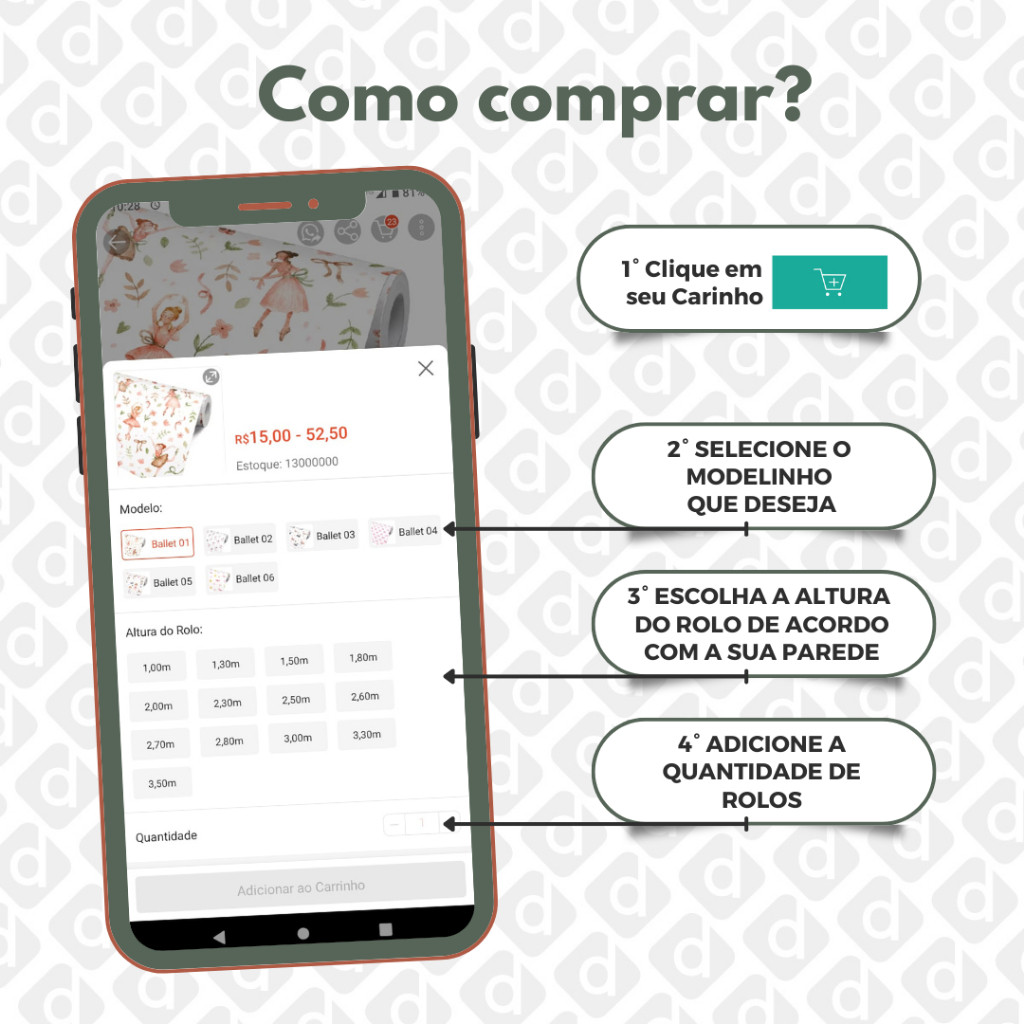 📏 Tamanho do Rolo Largura padrão: 50 cm Altura: Escolha disponível nas variações do anúncio 🧱 Indicação de Aplicação Indicado para qualquer superfície lisa, como: Paredes Madeira ou MDF Vidro Metais Gesso ❗ Não aplicar em: Tinta magnética ou acetinada Superfícies úmidas, com relevo ou porosas ⚠️ Informações Importantes As cores podem apresentar variação de até 15% conforme a calibração da tela Antes da aplicação, alinhe corretamente as emendas Fabricado com 1 cm de sobreposição lateral para um encaixe perfeito Pode haver diferença de tonalidade entre lotes diferentes ✅ Vantagens Aplicação simples, sem uso de cola Dispensa mão de obra profissional Ótima solução para renovar ambientes de forma rápida e prática 🔎 Características do Produto Superfície lisa, sem relevo ou textura Material antimofo, sem cheiro e resistente ao fogo Limpeza fácil com pano úmido e sabão neutro Impressão digital em alta resolução com cores vivas Acabamento fosco, com efeito antirreflexo Espessura: 0,10 mm Durabilidade: até 5 anos em ambiente interno 📐 Exemplo de Cálculo de Quantidade Para uma parede com 3,00m de largura x 2,50m de altura, você vai precisar de 6 rolos de 2,50m de altura (cada rolo cobre 0,50m de largura). 📩 Ficou com dúvidas? Nos envie as medidas da sua parede (Altura x Largura) e te ajudamos com o cálculo ideal.