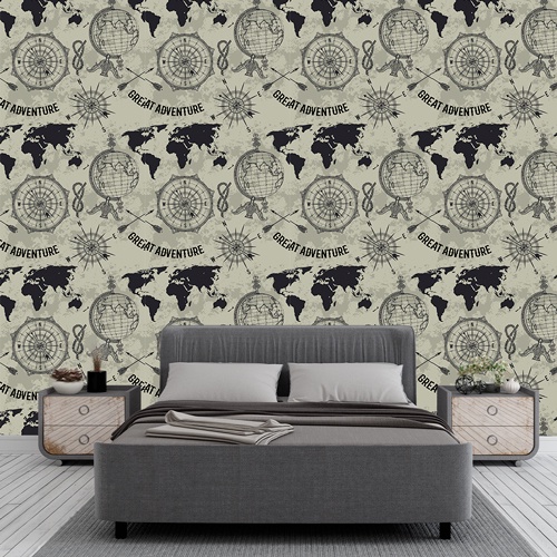 Papel de Parede Adesivo Adventure Mapa e Bússola Tons Bege e Preto Teen Aventura Mapa Mundi