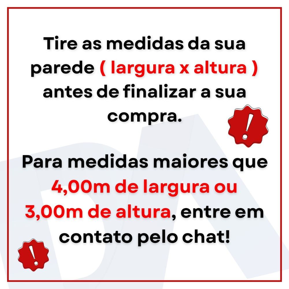 PAINEL ADESIVO PERSONALIZADO – ESCOLHA A MEDIDA CERTA PARA SUA PAREDE ✅ Antes de Comprar (IMPORTANTE) Para evitar erro no tamanho, sempre escolha a medida MAIOR que a sua parede. Exemplo: Se sua parede tiver 2,45m de altura, selecione a opção 2,50m. Alturas disponíveis: 1,50m • 2,00m • 2,30m • 2,50m • 2,70m • 3,00m Larguras disponíveis: 1,50m • 2,00m • 2,50m • 3,00m • 3,50m • 4,00m Para medidas acima disso, chame no chat que fazemos sob encomenda. 📏 Sobre o Painel Produzido sob medida conforme a altura e largura escolhidas. A arte é ajustada para manter proporção e qualidade. Enviamos o painel em rolos de 50 cm de largura para facilitar: envio aplicação alinhamento Cada rolo é numerado (Rolo 1, Rolo 2, etc.) para facilitar a instalação. 🎥 Aplicação Fácil Acompanha QR Code com vídeo ensinando como aplicar o painel sozinho, permitindo que você economize com mão de obra. 🧱 Onde Aplicar Ideal para superfícies lisas: ✔️ Parede com massa corrida ✔️ Pintura látex ou acrílica comum ✔️ Azulejo liso ✔️ Porta, vidro e divisória ❌ Não aplicar em: Tinta lavável / superlavável Paredes com textura Superfície úmida ou com poeira Tinta lavável impede a aderência e pode causar descolamento. 🎨 Tonalidade Nunca compre em datas ou lotes diferentes. A impressão pode ter variação de cor, por isso compre sempre tudo de uma vez. ❗ Após a Compra Evite cancelar o pedido, pois isso afeta a reputação da nossa loja. Por isso reforçamos: confira a medida da parede antes da compra. 📞 Dúvidas? Não sabe qual medida escolher? Chame no chat! Respondemos rápido e ajudamos você a selecionar o tamanho correto.