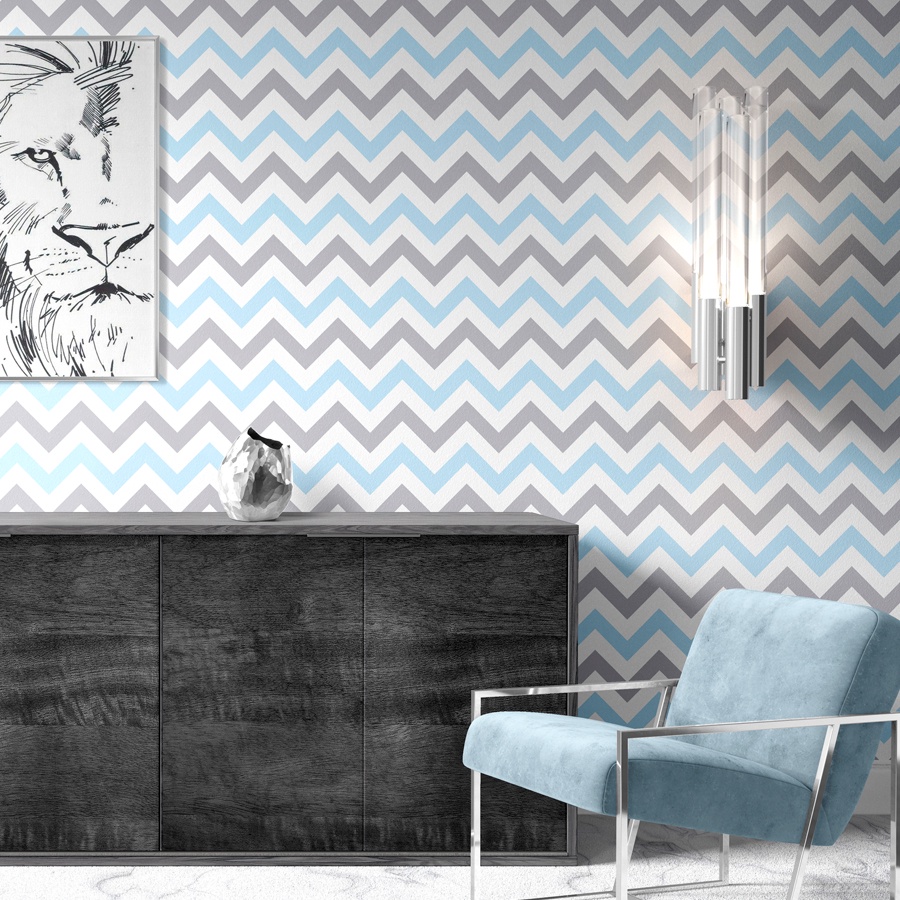 Papel de Parede Adesivo Chevron Zig Zag Azul e Cinza Lavável