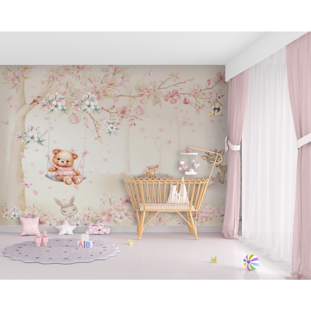 Papel De Parede Adesivo Decorativo Balanço Ursinha Flores Quarto Menina Delicado Jardim