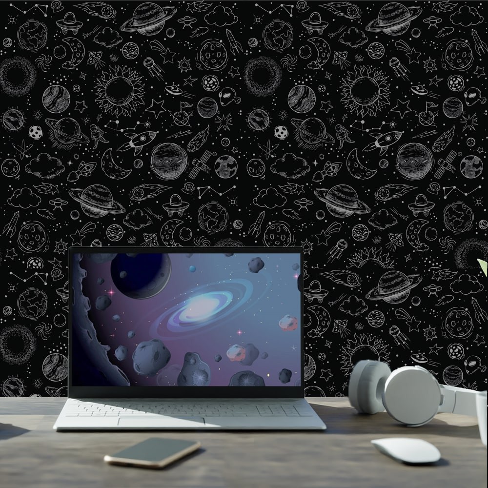Papel de Parede Adesivo Espaço Sideral Fundo Preto Para Quarto Gamer Infantil