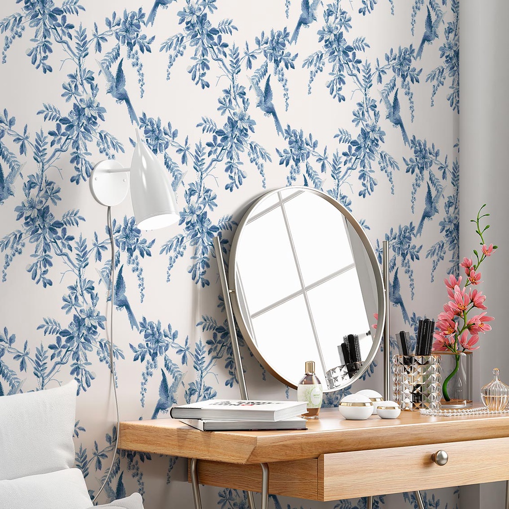 Papel de Parede Adesivo Floral Flores Pássaros Provençal Azul SSFL-056