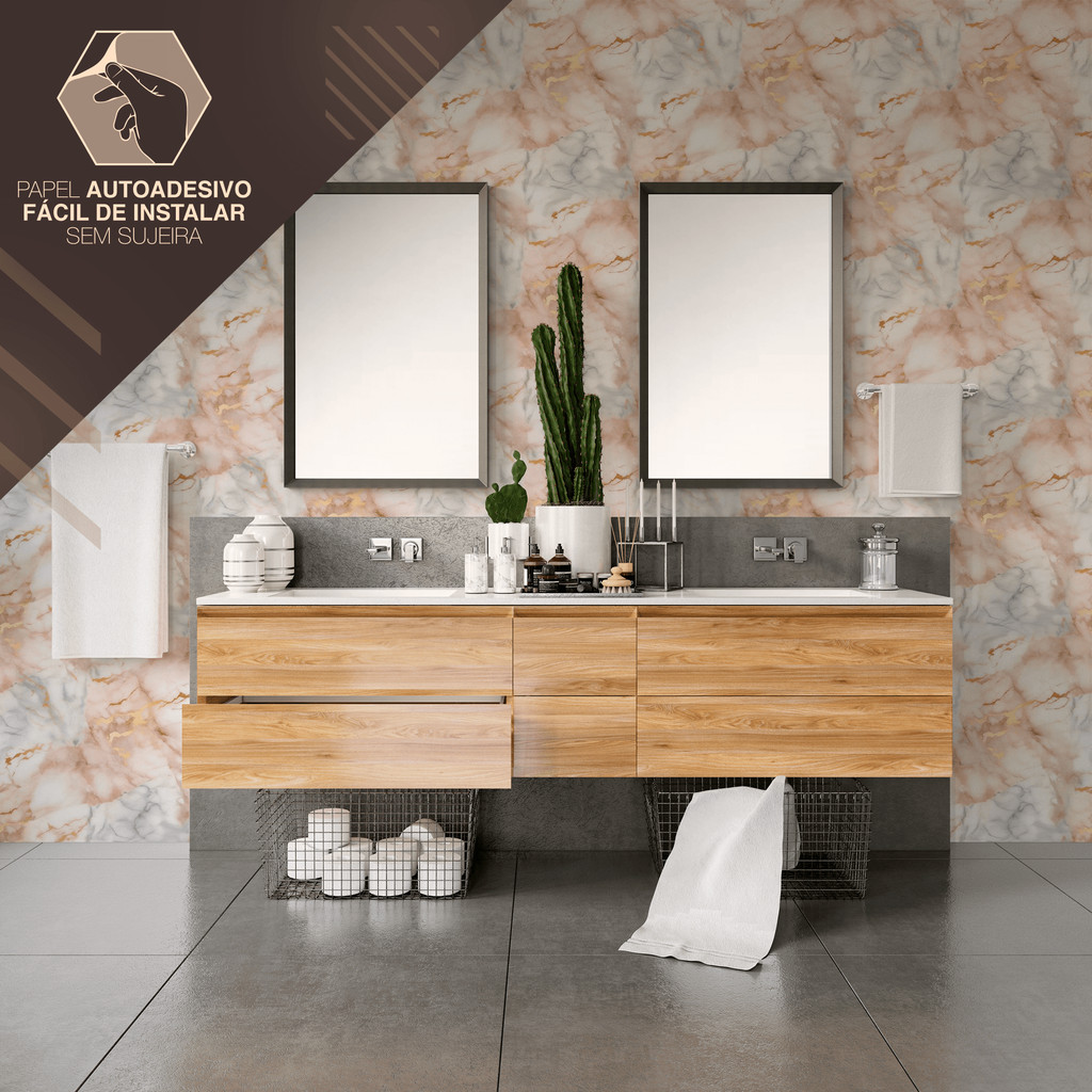 Papel de Parede Adesivo Mármore Rosa Cinza Dourado Resistente Fácil de Aplicar