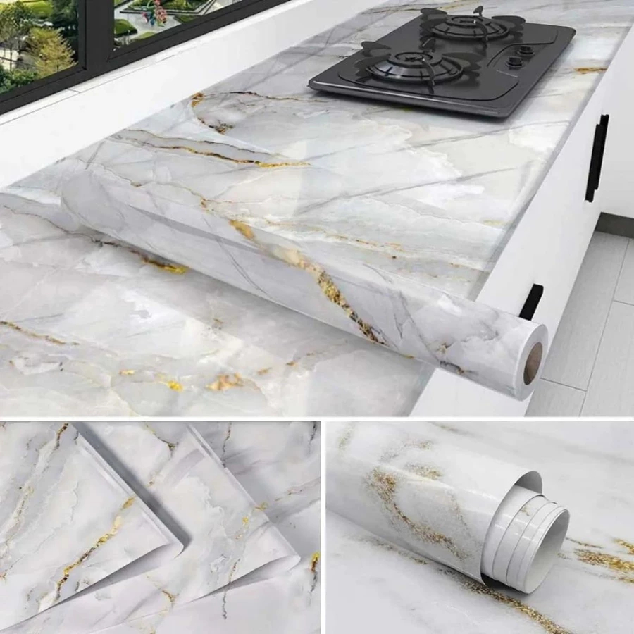 Papel de parede Adesivos para cozinha quarto Brilhante Lavável Mármore gelo 10/5M x40cm Resistente Agua