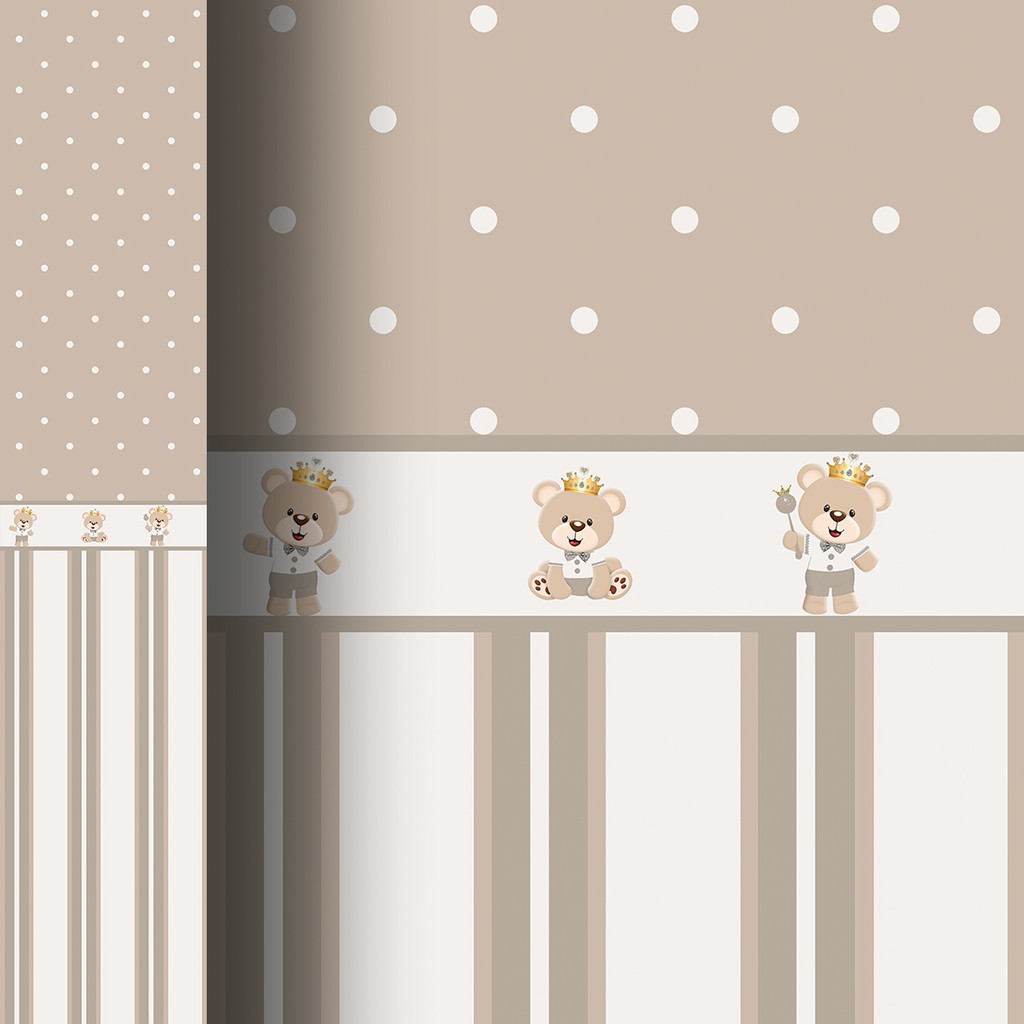 Papel de Parede Infantil Adesivo Quarto de Bebê Bege e Marrom Listrado e Poá Bolinhas Com Faixa de Ursinho Príncipe Realeza Corôa - SSBB-099