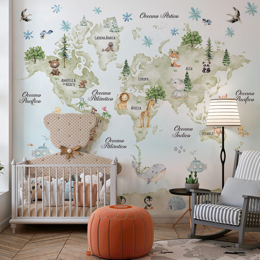 Papel de parede infantil mapa múndi tons claros com animais leão raposa urso baleia