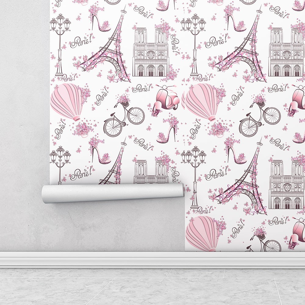 Papel de Parede Infantil Paris fundo rosa claro Lambretas e Flores Para Sala e Quarto 1,50 mts