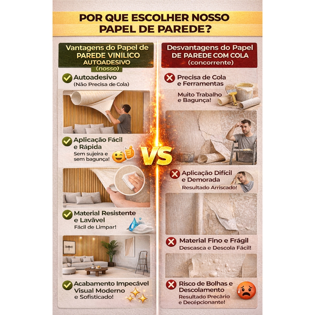 🏡 Papel de Parede Adesivo Vinílico Alta Qualidade • Fácil Aplicação • Acabamento Impecável Transforme seu ambiente sem sujeira e sem quebra-quebra com o Papel de Parede Adesivo Vinílico. Produzido com material resistente, durável e fácil de aplicar, é a solução ideal para renovar qualquer espaço com rapidez e elegância. 📏 Medidas & Como Comprar (Simples e Sem Erro) ✔️ Largura padrão: 40 cm por rolo ✔️ Altura:você escolhe conforme a altura da sua parede 📦 Venda por rolo de 40 cm de largura, com a altura escolhida por você. 👉 Exemplo 1 – Altura da parede Sua parede tem 2,70 m de altura ➡️ Recomendamos comprar 3,00 m de altura ✔️ Garante margem para recortes e ajustes na instalação. 👉 Exemplo 2 – Largura da parede Sua parede tem 2,00 m de largura 📐 Cálculo: 2,00 m ÷ 0,40 m = 5 rolos ➡️ Você precisará de 5 rolos para cobrir toda a largura da parede. ✨ Principais Benefícios ✅ Material vinílico encorpado e resistente ✅ Autoadesivo – não precisa de cola ✅ Aplicação rápida, prática e sem sujeira ✅ Visual moderno que valoriza o ambiente ✅ Ideal para salas, quartos, escritórios e comércios 🧼 Limpeza Fácil ✔️ Pano úmido ✔️ Sabão neutro ❌ Não utilizar produtos abrasivos 💬 Ficou com dúvida? 📲 Envie no chat a altura e largura da sua parede 👉 Nosso time calcula a Quantidade ideal, evitando desperdícios. 🚀 Renove seu ambiente hoje mesmo com praticidade, economia e estilo!