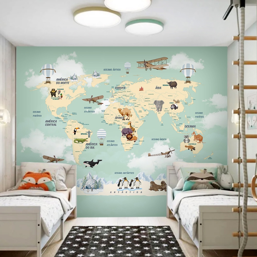 Papel de Parede Mapa Mundi Safari Cores Personalizadas Quarto Infantil e Bebê m²