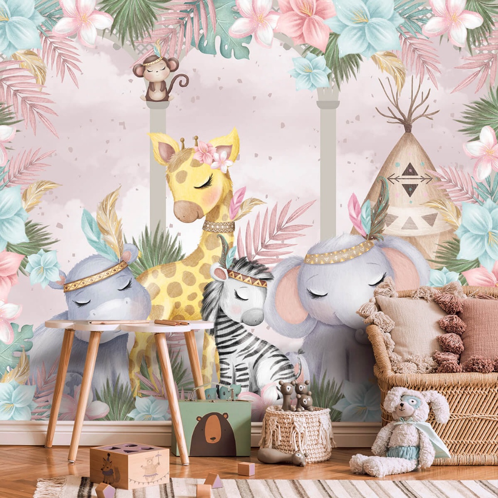 Papel de Parede Personalizado Safari Cute Com Flores Decoração Quarto de Menina Inove