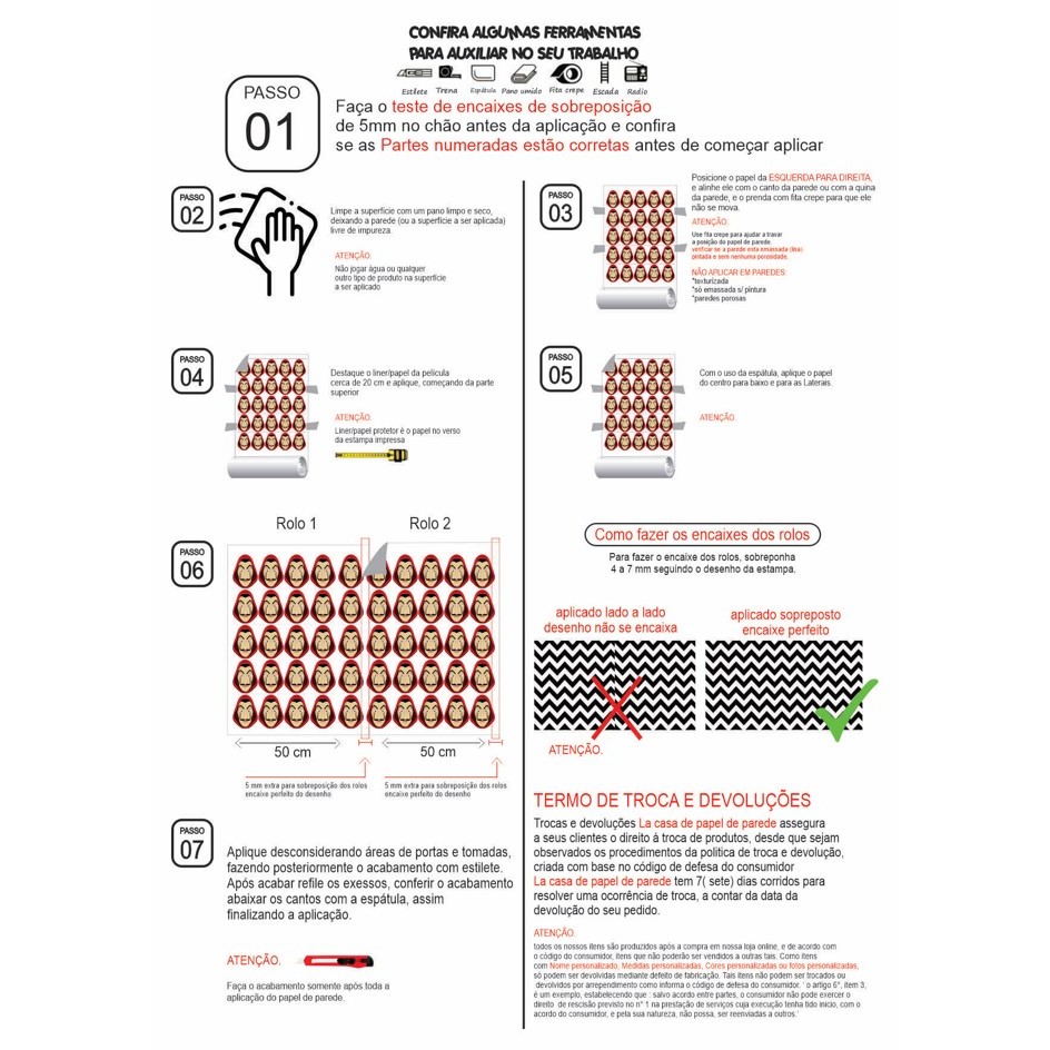 Olá, Somos a La casa de Papel de Parede. TRABALHAMOS COM O MELHOR MATERIAL DO MERCADO PARA APLICAÇÃO, 140GR - 010 ESPESSURA. FACILITA NA APLICAÇÃO, NÃO RASGA FACIL E NÃO É PROMOCIONAL. TEMOS A MELHOR IMPORTAÇÃO DA CHINA, EM MATERIA PRIMA. PRIORIZANDO A QUALIDADE E A FACILIDADE PARA NOSSOS CLIENTES NA APLICAÇÃO! O Papel de Parede Autocolante é uma excelente alternativa para você mesmo decorar sua casa de forma prática e econômica sem fazer sujeira, deixando o ambiente moderno e muito mais elegante e sofisticado. DESCRIÇÃO: - Fabricamos qualquer tamanho - Esse anuncio é vendido por rolo: 1 m Largura x 50 cm Altura O nosso Papel de Parede é atóxico, não agride o meio ambiente e nem a sua saúde pois é autocolante, não possui relevo, tem sua superfície lisa, não necessitando de cola como outros papéis de parede convencionais, ele se adapta a diversas superfícies lisa. Podendo ser utilizado para decorar praticamente todos os ambientes de sua casa, os quartos de crianças, consultórios pediátricos, lojas de roupas, cozinha e o que mais sua necessidade imaginar. RECOMENDAÇÕES: Recomendamos que a superfície aplicada seja lisa, sem porosidades ou texturas. É imprescindível que antes da colocação a parede esteja limpa, sem poeira ou umidade para maior durabilidade e acabamento! Não aplicar em parede com mofo, texturas, rústicas, bolor, umidade ou infiltrações, aconselhamos sempre em parede com gesso ou massa corrida lisa e uma demão de tinta; A cor real do produto pode apresentar até 15% de diferença nas tonalidades visualizadas em seu monitor e por encomendas realizadas em períodos diferentes por lote de cada produto. Por este motivo é muito importante que antes de realizar o pedido de compra, você possua as medidas exatas de altura e largura, incluindo portas, janelas e vãos. LIMPEZA E CONSERVAÇÃO: Para garantir maior durabilidade do desenho, limpe seu papel de parede apenas com um pano umedecido com sabão neutro, (ou pano úmido só com água). Se o papel de parede for aplicado em locais com incidência de raio UV (ultravioleta), após a impressão, algumas cores poderão se deteriorar em até dois anos. Vantagens: Papel de parede autoadesivo impresso em alta resolução com 1900 dpis. Impressão em adesivo fosco acetinado, ou seja, o produto possui um leve brilho proporcionando menos reflexo na foto ou vídeos. Produto lavável, e não propaga fogo. COMPRA DO PRODUTO: Calcule corretamente sua necessidade, pois compras efetuadas em períodos distintos poderão ocorrer diferenças de tonalidades nos produtos de até 15%. APLICAÇÃO: Aplicar os papéis de parede sempre na vertical, da esquerda para direita, respeitando a sobreposição de 5mm. Evite aplicar em paredes pintadas recentemente, aguarde no mínimo 10 dias. Não Aplicar em paredes com tonalidade escura ou por cima de outro papel de parede, pois poderá ocorrer transparência. O produto autoadesivo requer paciência na aplicação, caso não seja seu perfil contrate um profissional em aplicação de papel de parede autoadesivo. TROCAS E DEVOLUÇÕES: Para trocas e devoluções não será permitido qualquer indicio de uso ou avaria do papel de parede. Montagens desmontagens e instalações são de responsabilidade do cliente, estes serviços não estão inclusos no valor do produto. Estamos a disposição para qualquer esclarecimentos!