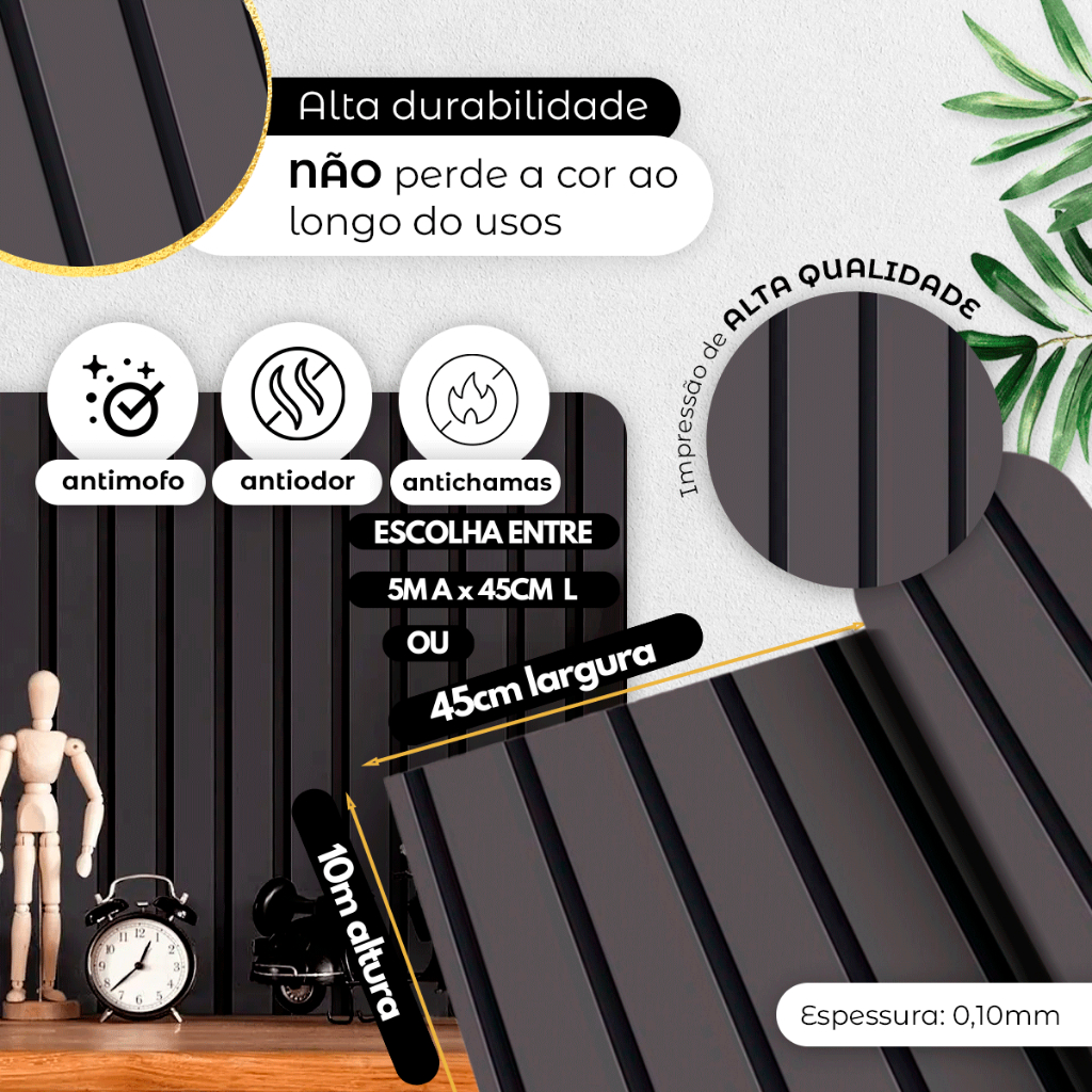 ESCOLHA ENTRE 5 METROS OU 10 METROS SELECIONANDO A QUANTIDADE NO ATO DE EFETUARA COMPRA XXX PRODUTO A PRONTA ENTREGA NO BRASIL XXX ------ ENVIO MAIS RÁPIDO DA SHOPEE ------------ ** Comprando até 15:50 ENVIAMOS NO MESMO DIA ** ** Produto Original com Nota Fiscal ** ** Compra Garantida pela Shopee ** EMBALAGEM Seu produto será embalado com todo cuidado Para que chegue perfeito sem danos para você. ******************************************************************************************** COMO CALCULAR QUANTO ROLOS PRECISO? - Medir a altura e largura da parede - Multiplicar a altura pela largura e dividir o resultado por 2,25. - O resultado será a quantidade de rolos necessárias - Se der numero quebrado arredondar para cima. *Atenção: É de extrema importância que o cliente saiba a metragem do local antes de adquirir o material, pois há variação de cores entre lotes. NÃO NOS RESPONSABILIZAMOS POR COMPRAS DO MESMO PRODUTO, FEITO EM PERÍODOS DIFERENTES E NEM POR INSTALAÇÕES. Transforme instantaneamente qualquer ambiente em um espaço aconchegante e elegante com nosso deslumbrante papel de parede ripado de madeira. Criado com maestria, este produto oferece a beleza intemporal da madeira natural, combinada com a praticidade e versatilidade de um papel de parede de alta qualidade. GUIA BÁSICO DE INSTALAÇÃO: 1 - Limpe e seque a área de aplicação. 2 - Corte o material um pouco maior do que a medida necessária. 3 - Descole uma ponta de 5 cm do papel protetor e aplique o produto a partir dos cantos da área a ser revestida. 4 - Com uma mão, descole aos poucos o papel protetor em diagonal. Com a outra, fixe o produto do centro para as bordas utilizando uma flanela. 5 - Para evitar bolhas pressione bem ao aplicar. 6 - Caso o material fique torto, descole o adesivo com cuidado e reinicie a aplicação. 7 - Pressione bem o produto aplicado para maior fixação. Para eliminar bolhas, faça pequenos furos com uma agulha fina. Onde posso aplicar? • Parede (interna ou externa) com massa corrida e tinta látex fosca (lisa) • Parede com azulejos • Qualquer superfície lisa e limpa (móveis, etc) CARACTERÍSTICAS - Pode ser limpo com pano úmido e sabão neutro. - Antimofo, não possui cheiro e não propaga fogo. - Durabilidade média de 5 anos em ambiente interno. - Produzido em vinil adesivo anti reflexo, fosco, sem brilho, próprio para decoração. - Impressão digital em alta resolução de imagem e cores vivas. - Os rolos se encaixam lateralmente, dando continuidade ao desenho. - Espessura: 0,10mm (mais firme e resistente, facilita o manuseio e aplicação). - Produto de fabricação própria.