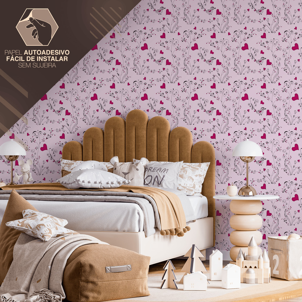 Papel de Parede Rosa Ramos de Corações Adesivo Fácil Aplicação