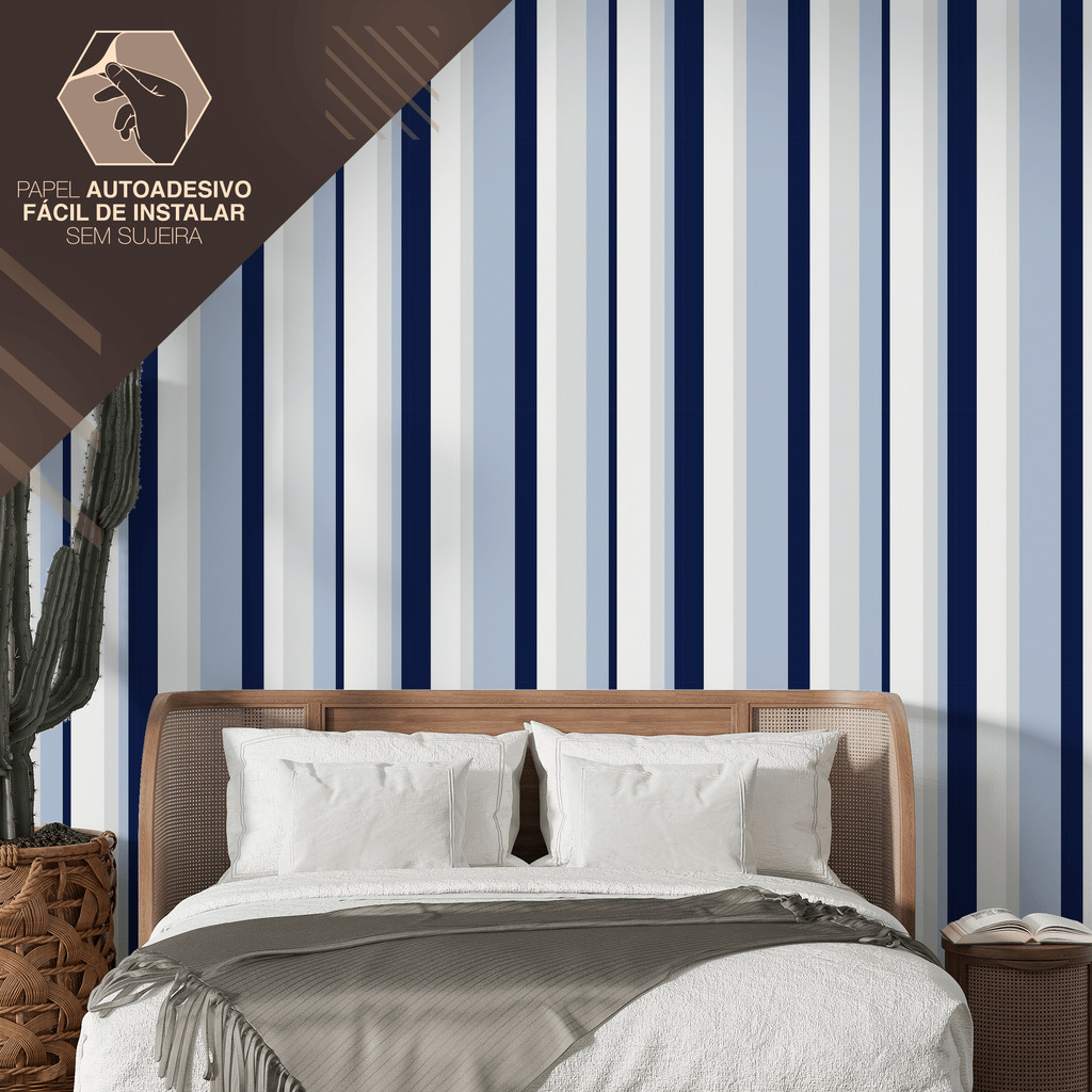 Papel de Parede Vinílico Adesivo Listrado Azul e Branco Fácil de Aplicar