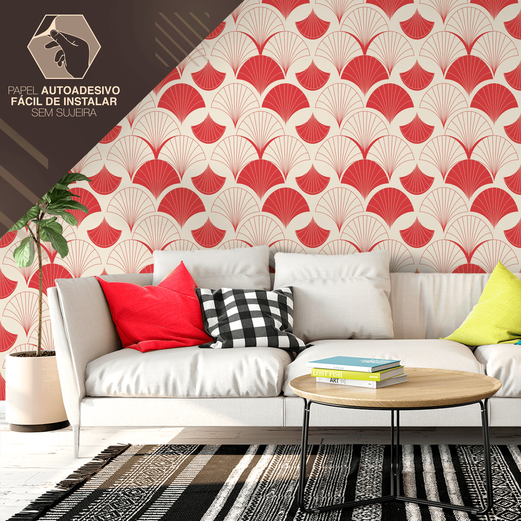 Papel de Parede Vinílico Leque Japonês Vermelho Nude Adesivo Resistente