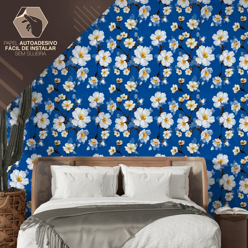 Papel de Parede Vinílico Pintura Azul Flores Brancas Adesivo Resistente