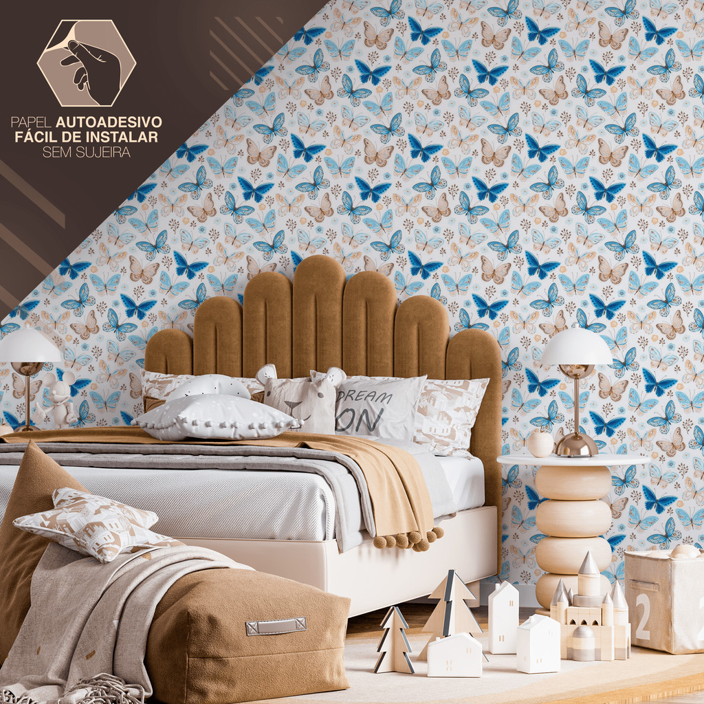 | Papel de Parede Vinílico Resistente Bege com Borboletas Azul Fácil ... este produto | R$ 38,90 | 35% | 4.8/5 | 11 |