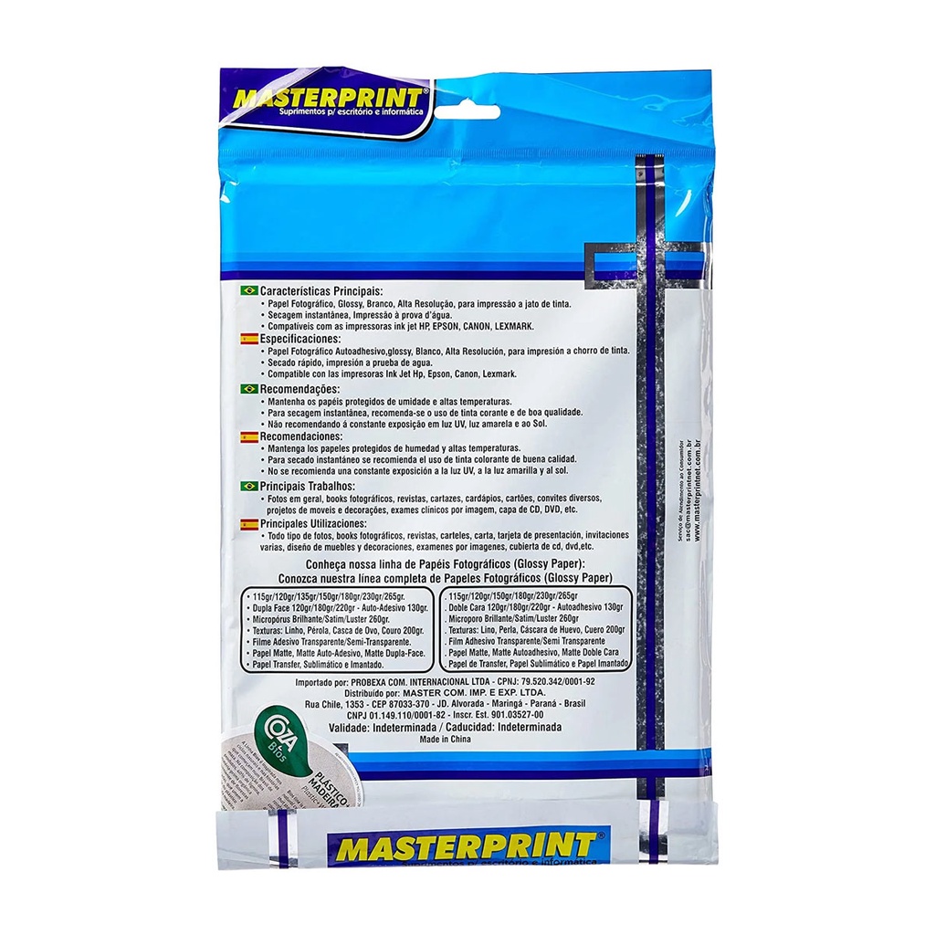 Bem-vindo(a) Paper Hope! Estamos muito felizes por tê-lo(a) conosco. Esperamos poder atender às suas expectativas e necessidades com excelência. Produto Papel Fotográfico Adesivo Glossy 115g A4 Gramatura: 115 g/m² Tamanho: A4 (297 mm x 420 mm) Tipo: Auto Adesivo Brilhante Cor: Branco Quantidade: 60 folhas (3 pacote com 20 folhas) Estado: Novo e Lacrado Marca: Masterprint Principais usos para o Papel Foto Adesivo Glossy: - Personalização de potes e garrafas - Personalização de brindes para festas - Fotos - Rótulos - Sinalização (Por exemplo: WC, Departamento Financeiro, etc) - Etiquetas - Adesivos em geral Principais vantagens do Papel Fotográfico Adesivo: Secagem instantânea, possui alta capacidade de absorção de tinta. Resistente à água, a impressão não borra. Contém microporos que ao receber a tinta se fecham automaticamente retendo a tinta e o deixando resistente à água, não mancha mesmo mergulhado em água. Impressões em alta resolução e definição com cores vivas e de qualidade. Observações para o uso correto: Recomendado uso de Tintas Corantes para secagem instantânea e impressões perfeitas. Não recomendado o uso de Tintas Pigmentadas. Não é recomendável a constante exposição em luz UV, luz amarela e ao sol. Em sua impressora, configure o tipo de papel para "Foto" e a qualidade de impressão para "Alta". Verifique se a gramatura do papel adquirido é suportada pela sua impressora, esta informação vem descrita no manual do usuário. Para gramaturas iguais ou superiores a 230 gramas, algumas impressoras tem dificuldade em puxar o papel, podendo estragar a folha e prejudicar a impressora. Verifique se a impressora é compatível com papéis de alta gramatura. Impressoras com alimentação superior tem mais facilidade para imprimir em papéis com gramaturas maiores, já impressoras com alimentação inferior são mais problemáticas e pode variar de modelo para modelo a capacidade de puxar papel mais espesso, para ter certeza é recomendado verificar no manual da sua impressora. Para uso em impressoras Jato de Tinta que utilizem tinta corante e suportem a gramatura descrita.