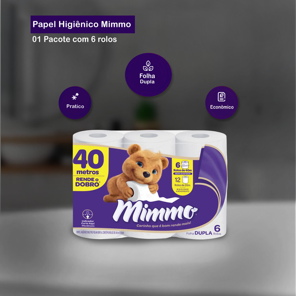 Papel Higiênico Folha Dupla 40m Mimmo Mimmo é a Marca de papel higiênico feita com matéria-prima de alta qualidade e tecnologia de ponta na produção. Suas folhas vêm com indicação de picote como sugestão de uso para evitar desperdício. O papel higiênico rende mais e tem maior duração! Primeiro, por ter indicação de picote inteligente para maior rendimento. Segundo Mimmo tem rolo com sistema abre fácil e evita desperdícios. Por fim, possui Macro Câmaras de ar que deixam o papel mais macio e mais absorvente. Tipo: Folha Dupla Metragem do Rolo: 40 metros Dimensões: 20 cm x 40m (LxC) Embalagem: 01 Pacote com 6 rolos
