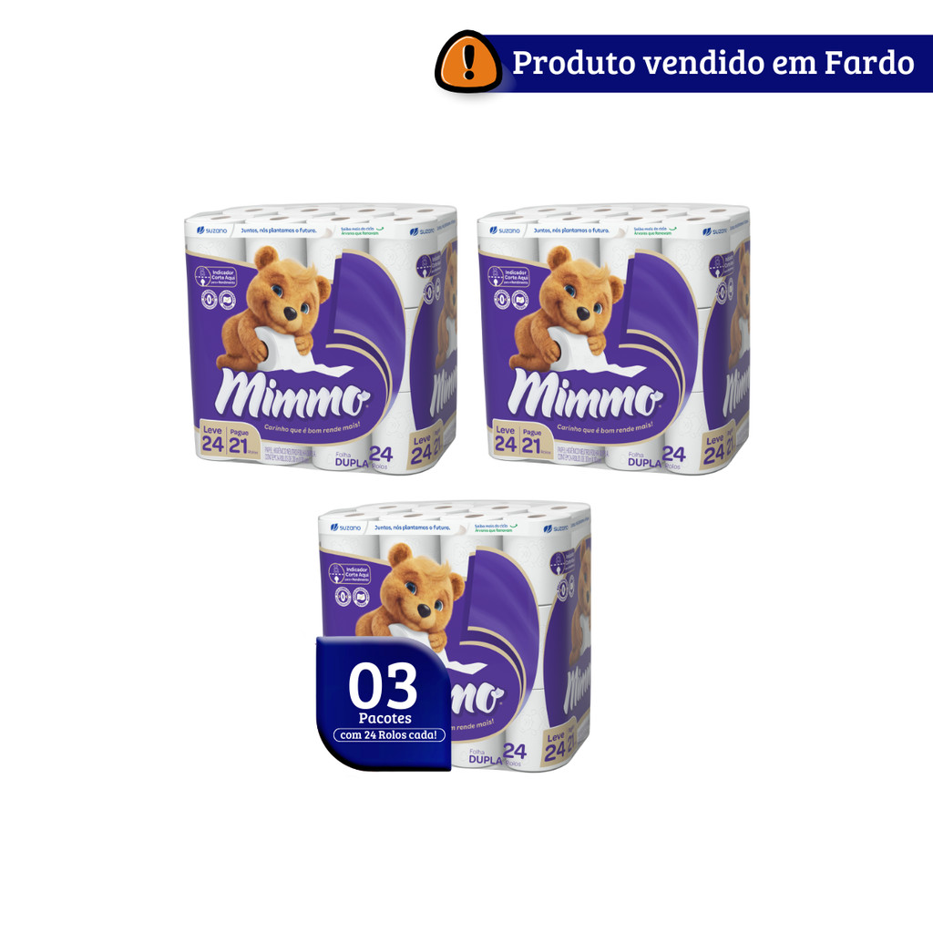 Papel Higiênico Folha Dupla 30m Leve 24 Pague 21 Fardo 3x24 Mimmo Mimmo é a linha de papel higiênico feita com matéria-prima de alta qualidade e tecnologia de ponta na produção. Suas folhas vêm com indicação de picote como sugestão de uso para evitar desperdício. Mimmo é mais macio, mais fofinho e você usa muito menos! O papel higiênico rende mais e tem maior duração! Primeiro, por ter indicação de picote inteligente para maior rendimento. Segundo, Mimmo tem rolo com sistema abre fácil e evita desperdícios. Por fim, possui Macro Câmaras de ar que deixam o papel mais macio e mais absorvente. Tipo: Folha Dupla Metragem do Rolo: 30 metros Dimensões: 10cm x 30m (LxC) Embalagem: 01 fardo contém 3 pacotes de 24 rolos cada