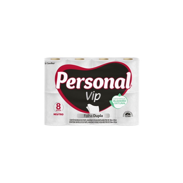 Chegou Personal® Vip, o novo papel higiênico folha dupla com a exclusiva Fórmula PróMaciez, que alia a nova textura com fibras naturais, extratos de algodão e argan, que possuem propriedades de maciez, cuidado e conforto. Cor: Branco Tipo: Folha Dupla Metragem do Rolo: 30 m Embalagem: Fardo com 08 pacotes, cada com 08 rolos