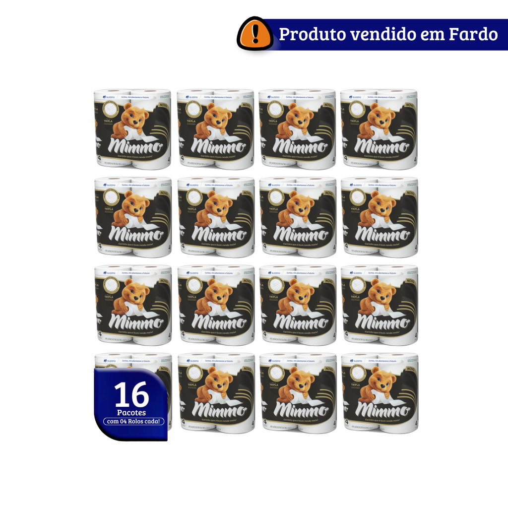 Papel Higiênico Folha Tripla 20m Fardo16x4 Mimmo Mimmo Folha Tripla Acolchoado tem três camadas de fibras naturais acolchoadas com a nova tecnologia cottonplush de ar que proporcionam a combinação perfeita de maciez e máximo rendimento. Além disso, Mimmo oferece maior rendimento e é dermatologicamente testado Máximo conforto graças a sua textura acolchoada, fragrância delicada para encantar os sentidos, com o toque de algodão. A folha dupla proporciona maior absorção e rendimento, reduzindo o desperdício. Tipo: Folha Tripla Metragem do Rolo: 20 metros Dimensões: 10cm x 20m (LxC) Embalagem: 01 fardo contém 16 pacotes de 4 rolos cada