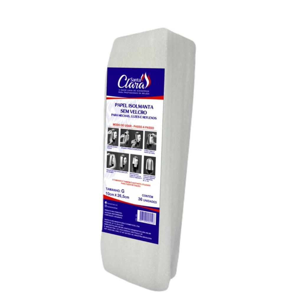 Papel Isolmanta Para Mechas luzes e Reflexos Santa Clara Tamanhos G - GG ( Cada pacote com 36 Unidades) O papel Isolmanta proporciona grande praticidade e auxilia durante procedimentos químicos. Existem tamanhos indicados para o comprimento de cabelos pequenos, médios e grandes, além disso, as luzes no papel aceleram o processo de clareamento dos fios, pois como é feito com um material que esquenta, ele abre as cutículas do cabelo e ajuda a descolorir mais rapidamente. Indicações - Tamanho P é indicado para cabelos curtos, franjas ou para retoques - Tamanho M, G ou EXG é utilizado nas mechas médias e mais longas de acordo com o comprimento Medidas: - Tamanho P Largura 10cm x Comprimento 13cm - Tamanho M Largura 10cm x Comprimento 22,5cm - Tamanho G Largura 10cm x Comprimento 26,5cm - Tamanho EXG Largura 10cm x Comprimento 40cm Benefícios: - Facilita o trabalho do profissional, garantindo mais segurança para o cliente - Garante um trabalho mais limpo e prático. - Não desliza - Não escorrega - Folhas já cortadas que não enroscam - Deixa a cor uniforme da raiz à ponta Para que serve ? - Para mechas, Luzes, reflexos entre muitas outras utilidades Modo de usar: - Encaixe o velcro do papel na raiz - Aplique o produto especificado - Cubra com a 2º parte do papel - Prenda os dois papéis com clips ou grampo - Em franjas e cabelos curtos usar tamanho P - Usar nas mechas longas e médias os tamanhos M/G/EXG