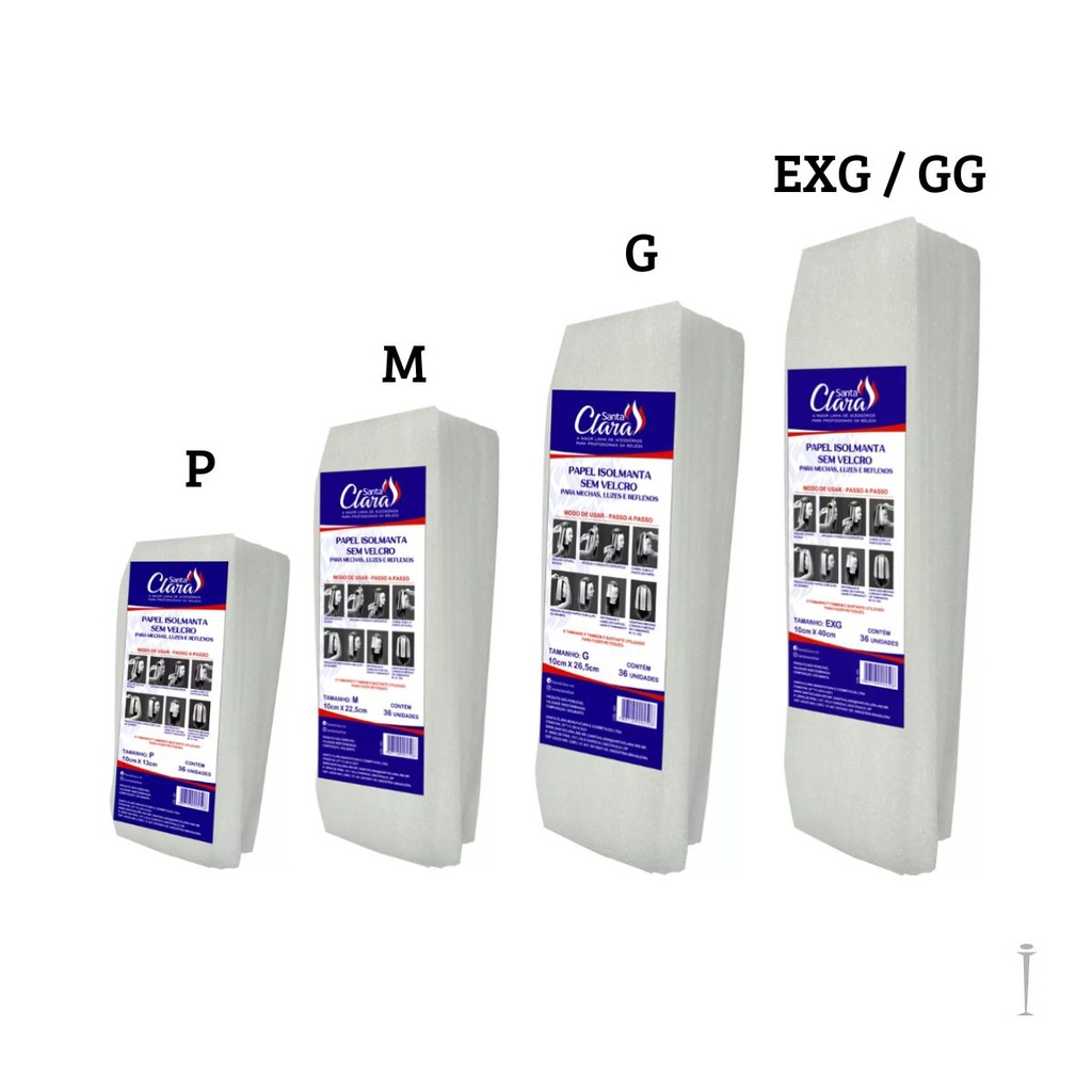 Papel Isolmanta Para Mechas luzes e Reflexos Santa Clara Tamanhos P - M - G - EXG ( Cada pacote com 36 Unidades) O papel Isolmanta proporciona grande praticidade e auxilia durante procedimentos químicos. Existem tamanhos indicados para o comprimento de cabelos pequenos, médios e grandes, além disso, as luzes no papel aceleram o processo de clareamento dos fios, pois como é feito com um material que esquenta, ele abre as cutículas do cabelo e ajuda a descolorir mais rapidamente. Indicações - Tamanho P é indicado para cabelos curtos, franjas ou para retoques - Tamanho M, G ou EXG é utilizado nas mechas médias e mais longas de acordo com o comprimento Medidas: - Tamanho P Largura 10cm x Comprimento 13cm - Tamanho M Largura 10cm x Comprimento 22,5cm - Tamanho G Largura 10cm x Comprimento 26,5cm - Tamanho EXG Largura 10cm x Comprimento 40cm Benefícios: - Facilita o trabalho do profissional, garantindo mais segurança para o cliente - Garante um trabalho mais limpo e prático. - Não desliza - Não escorrega - Folhas já cortadas que não enroscam - Deixa a cor uniforme da raiz à ponta Para que serve ? - Para mechas, Luzes, reflexos entre muitas outras utilidades Modo de usar: - Encaixe o velcro do papel na raiz - Aplique o produto especificado - Cubra com a 2º parte do papel - Prenda os dois papéis com clips ou grampo - Em franjas e cabelos curtos usar tamanho P - Usar nas mechas longas e médias os tamanhos M/G/EXG