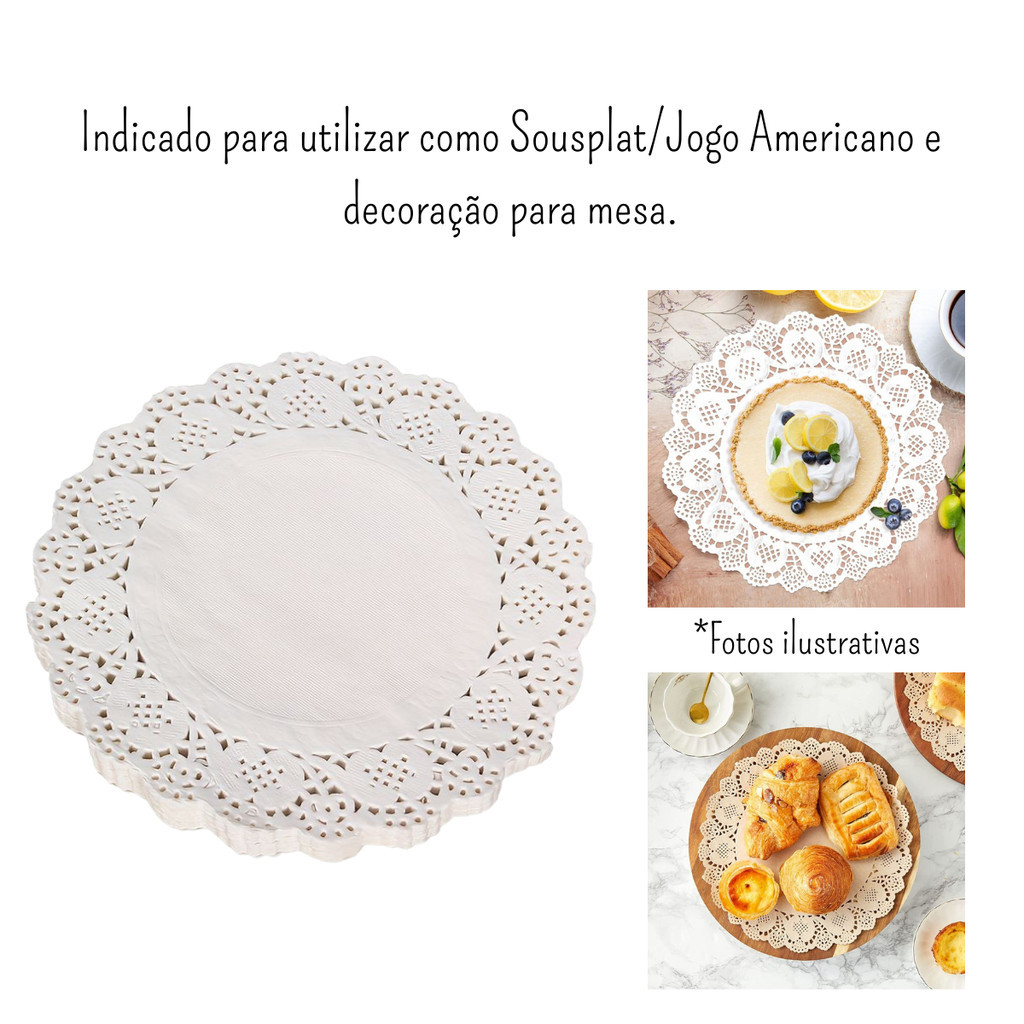 Lindas toalhas de papel rendado, chamados doilies.Para ser usado em convites, bandejas, lembranças, embalagens de presente, etc.- Tamanho: diâmetro 36,5cm.- Material: papel 80 unidades.- Cor: branco (intensidade das cores pode variar devido a tela do computador e lente da câmera).- Modelo: folha de papel rendado. - Descartável. - Imagens ilustrativas, não acompanha outros acessórios.