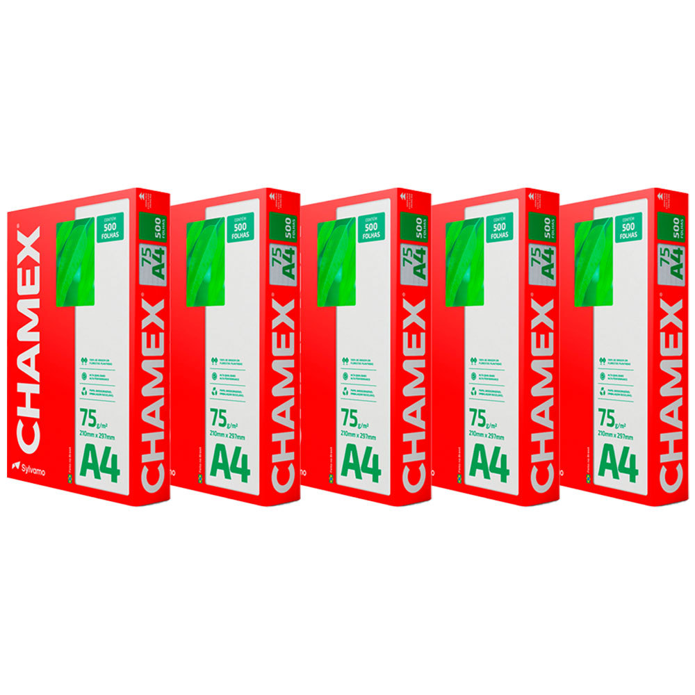 Chamex A4 75g garante ótima performance em todo tipo de atividade, como criar, escrever, imprimir e reproduzir. Com superfície resistente, corte perfeito e equilibrada absorção, permite melhor deslizamento do papel na impressora e evita desperdício de tinta. É produzido a partir do cultivo de eucalipto 100% renovável e as fibras são tratadas para obter o mais elevado grau de brancura. Para excelência nos resultados, é necessário que o papel seja armazenado em local adequado, isento de umidade e luminosidade excessiva, bem como isento de avarias que possam comprometer as características originais de fabricação do papel. Importante: a qualidade do papel influencia no processo de impressão, porém os componentes dos equipamentos, assim como a manutenção e qualidade deles também são responsáveis. Detalhes: - Gramatura: 75 g/m² - Formatos: A4 (210 x 297 mm) - Folhas/resma: 500