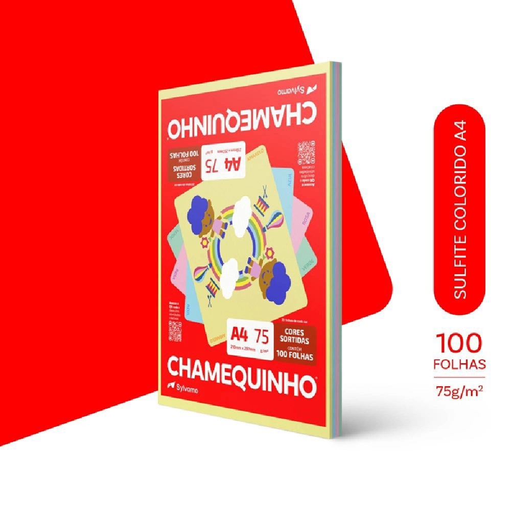 Papel sulfite A4 colorido 210x297 com 100 fls - Chamequinho Detalhes: - Chamequinho 4 cores: Amarelo, azul, rosa e verde - Gramatura: 75g/m² - Formatos: A4 (210 x 297 mm) - Folhas/resma: 100 folhas (25 de cada cor) - Ideal para todas as atividades em casa e na escola.