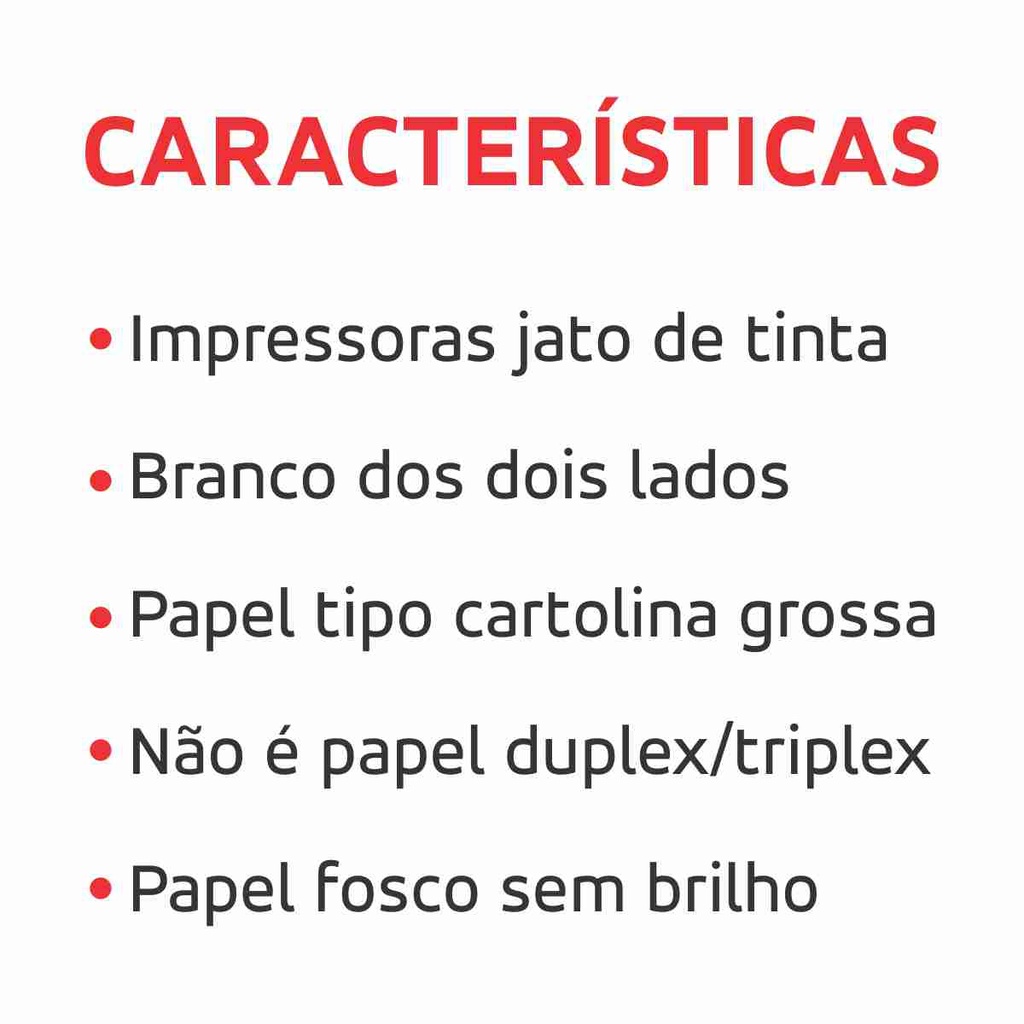 A pronta entrega, envio em até 24hrs! - NOTA FISCAL!! NOSSO DIFERENCIAL: -EMBALAGEM REFORÇADA, confira nossos outros anúncios, os produtos chegam aos compradores intactos! -ENVIO O PRODUTO ANUNCIADO, aqui não enganos o comprador, você vai compra e receber o produto do anúncio! -ENVIO RÁPIDO, enviamos seu pedidos em até 24h. Pode ser impresso em jato de tinta ou laser, poder ser usado em desenhos ou pinturas. Branco fosco frente e verso, cortado no tamanho A4. Embalado em pacotes de 100 folhas com embalagem plástica para proteger da umidade. Pacote com 100 folhas - Alta brancura; - Excelente ancoragem de tinta; - Perfeita fixação de acabamentos; - Fosco de Ambos os lados; - Papel Branco Grosso 180g/m²; - Tamanho A4 ( 210mm x 297mm ); Ideal para: Impressos Caixinhas Calendários Postais Tags Embalagens Cartões de Visita Capa de livro Impressos gráficos