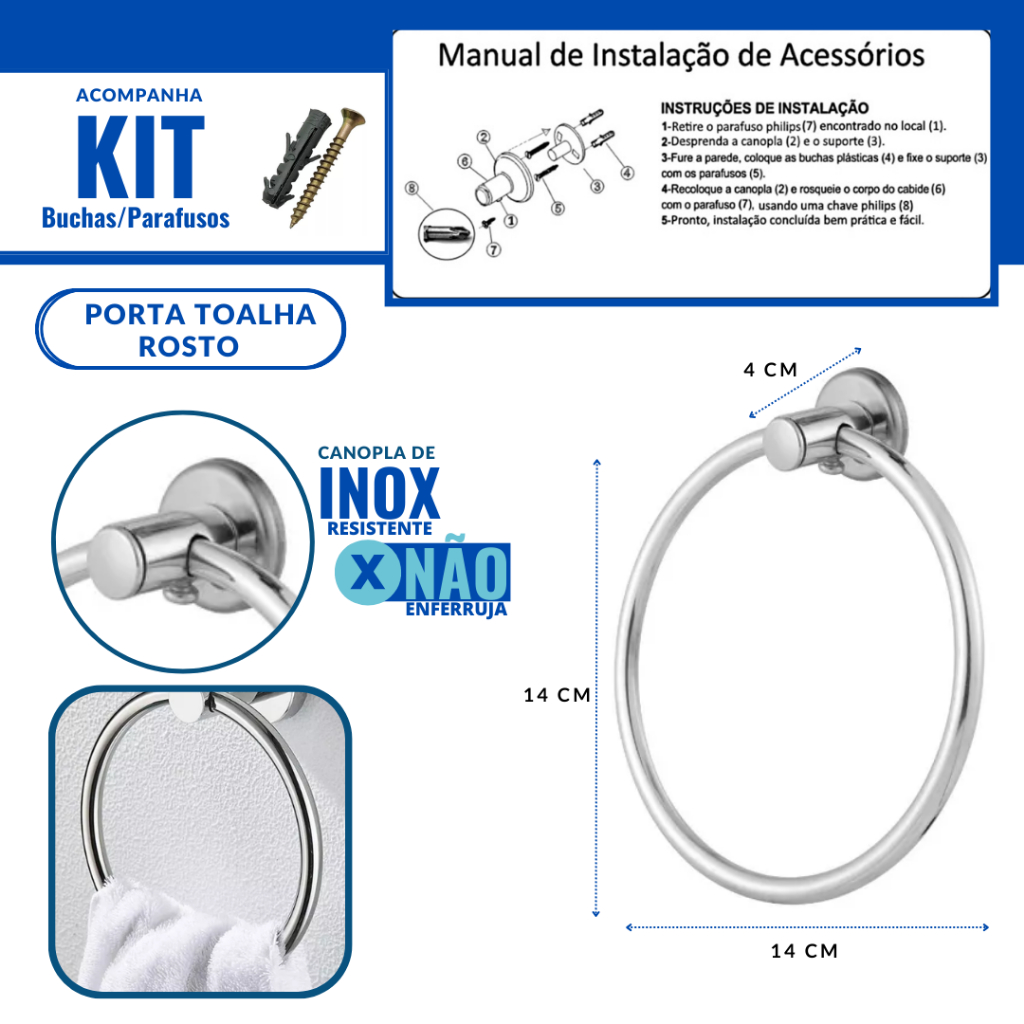 Conjunto papeleira e Porta Toalha Argola toalha de rosto para banheiro. CARACTERÍSTICAS: Produto produzido em inox. Banho de anodização realizado, o qual é específico para peças produzidas em alumínio, dando a proteção necessária ao produto, sem correr o risco de descascar, pois o mesmo não cria camada. ITENS INCLUSOS: 01 - Suporte para papel higiênico em inox com tampa. 01 - Porta Toalha Argola toalha de rosto com furo em inox. ACOMPANHA BUCHAS E PARAFUSOS PARA INSTALAÇÃO.