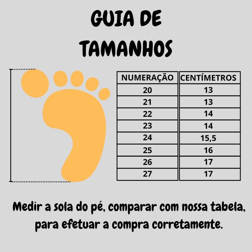 Medidas Sobre o Comprimento do Produto 20 - 13 cm 21 - 13 cm 22 - 14 cm 23 - 14 cm 24 - 15,5 cm 25 - 16 cm 26 - 17 cm 27 - 17 cm **** INFORMAÇÕES TÉCNICAS *** Cor: Sempre seguir a cor original da foto produto. Material: Tecido Cacharrel Solado: PVC Expandido Palmilha: E.V.A E Macia com aplique da logo. Numeração: será enviada pelo critério de escolha Caixa embalagem: cada par vai a sua caixa individual. Frete: Conforme regras da Plataforma Marca: YAHUP