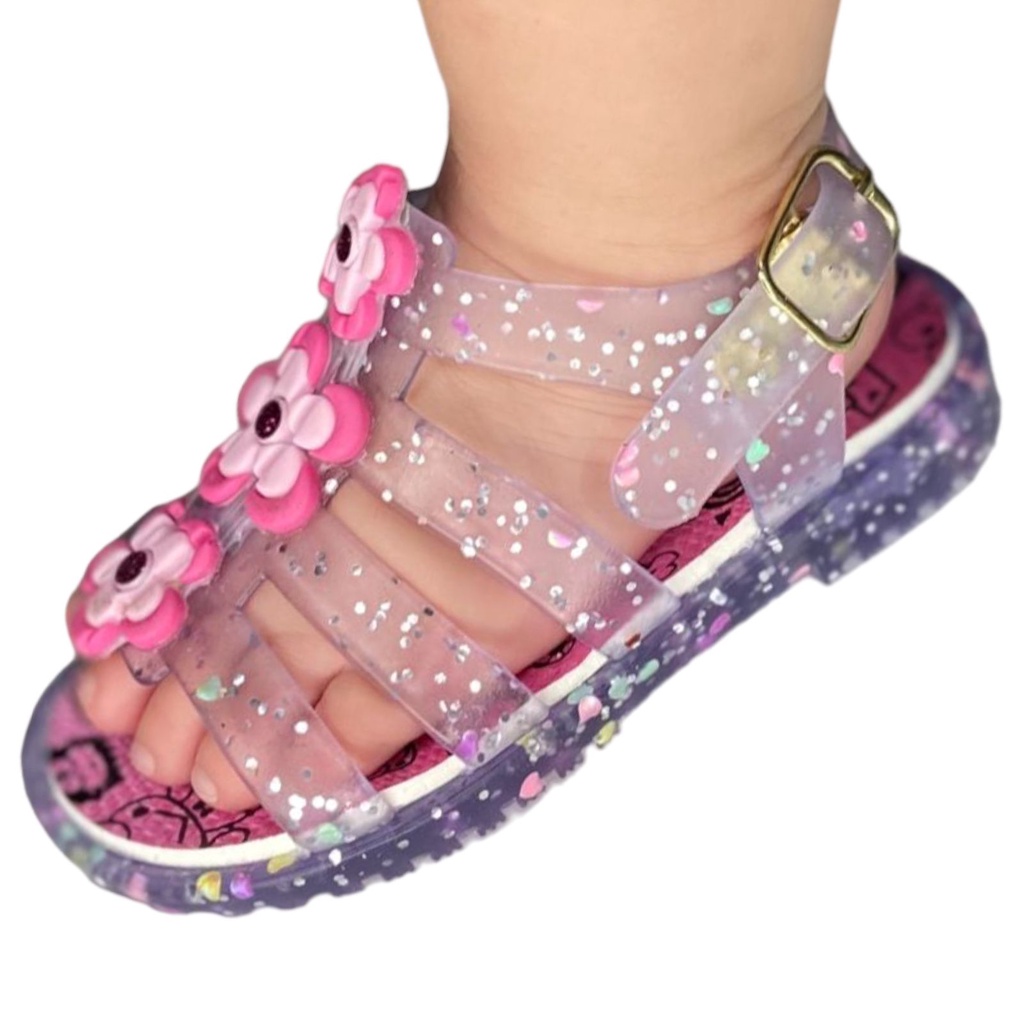 Papete menina 3 flores sandália infantil cristal com led verão 2026 juju shoes