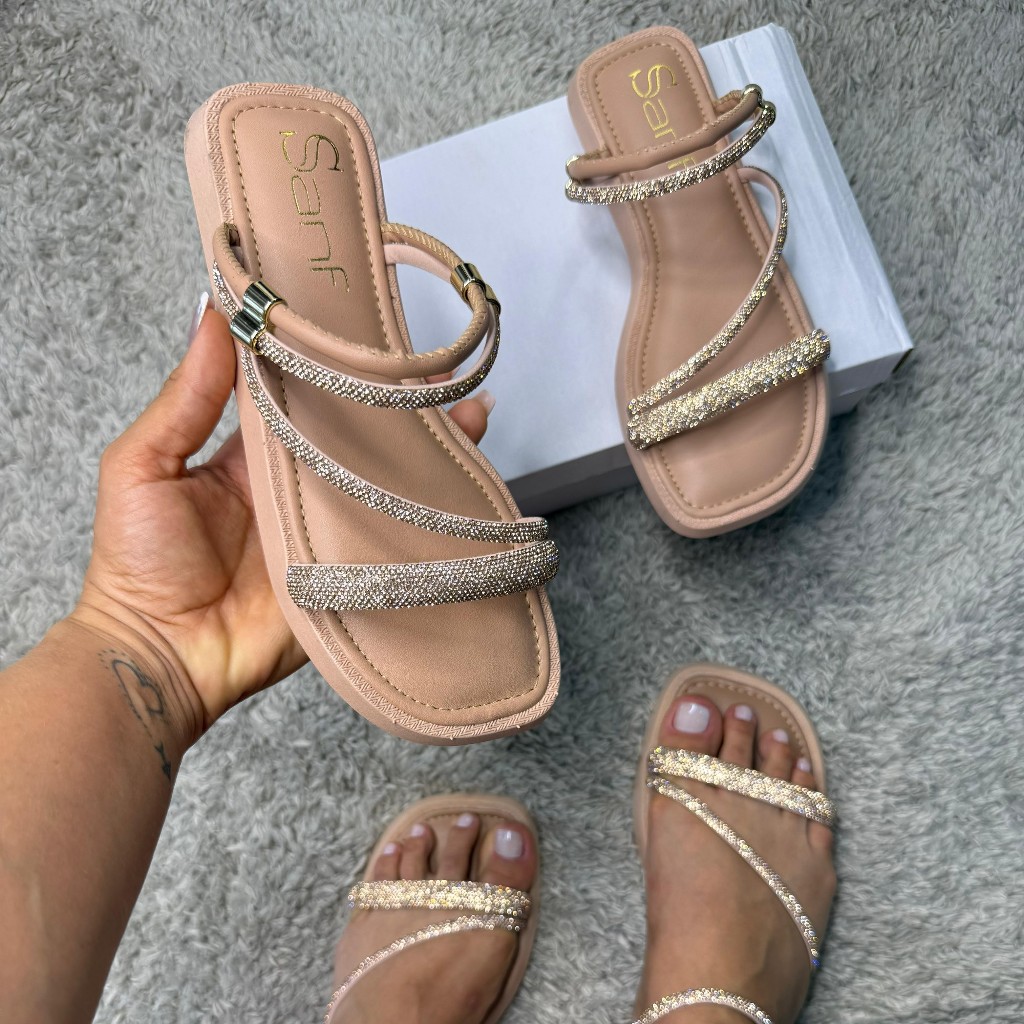 Papete Sanf Flat Confortável Macia Brilho Strass Elegante Pedraria Rasteira Sandália Feminino Básica