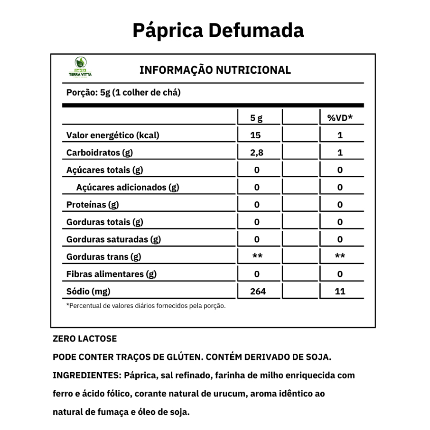 A páprica defumada premium é uma especiaria feita a partir de pimentões e pimentas, ela é muito utilizada no Brasil e nos países ibéricos como tempero A páprica pode ser adicionada a pratos refogados como legumes (feijão, lentilha, grão-de-bico), vegetais (brócolis, cenoura, batata) e sopas, sendo encontrada nas versões doce, defumada e picante. Ingredientes: Paprica,sal refinado, farinha de milho enriquecida com ferro e ácido fólico,corante natural de urucum, aroma idêntico ao natural de fumaça e óleo de soja. ALÉRGICOS: PODE CONTER TRAÇOS DE GLÚTEN, LEITE, SOJA, AMENDOIM E CACAU POR CONTAMINAÇÃO CRUZADA. *INFORMAÇÕES ADICIONAIS* - EMBALAGEM MERAMENTE ILUSTRATIVA - PODE HAVER VARIAÇÃO DE COR DEPENDENDO DO LOTE.