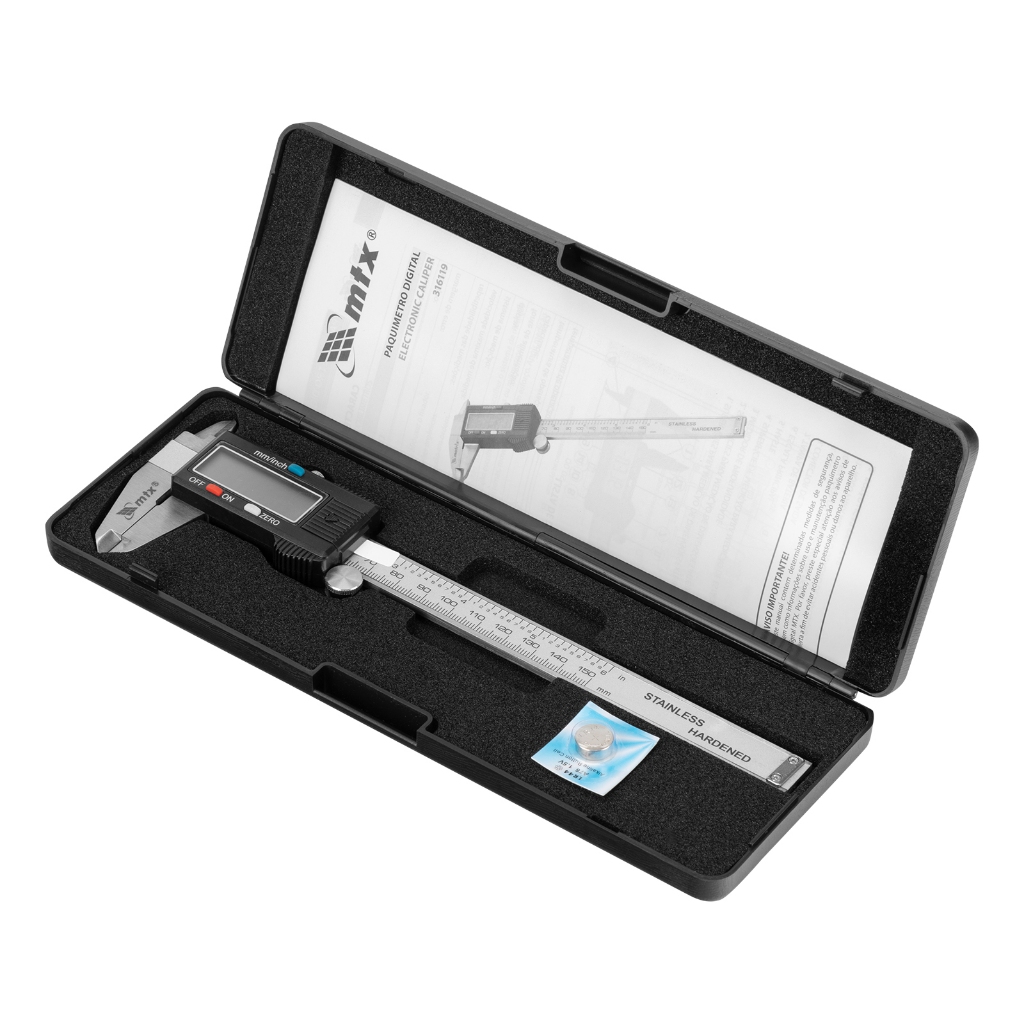 Paquímetro Digital em Aço Inox - 150 mm / 6'' / 0.01 Descrição: - Paquímetro Digital em Aço Inox 150 MM modelo 316119 da marca MTX é ideal para realizar medições de maneira fácil e em projetos que exijam melhor precisão. Sua faixa de medição é de 0 a 150 mm (de 0 a 6") com precisão de 0,03 mm (100–200 mm). podendo ser feitas medidas externa, interna, profundidade e ressalto; Informações Gerais: - Praticidade; - Excelente precisão; - Diferentes medidas (Interna, externa, profundidade e ressalto); - A alimentação é feita por duas baterias 1,5 V - SR 44 e vem acondicionado em um estojo plástico para proteção do mesmo. Especificações Técnicas: - Quantidade de medições: 4; - Material: Aço inox; - Display: LCD; - Capacidade: 150 mm; - Faixa de medição: 0 a 6"; - Alimentação: 2x 1,5 V - SR 44. Itens Inclusos: - 1 Estojo plástico; - 1 Paquímetro digital - 150 mm / 6" / 0.01.