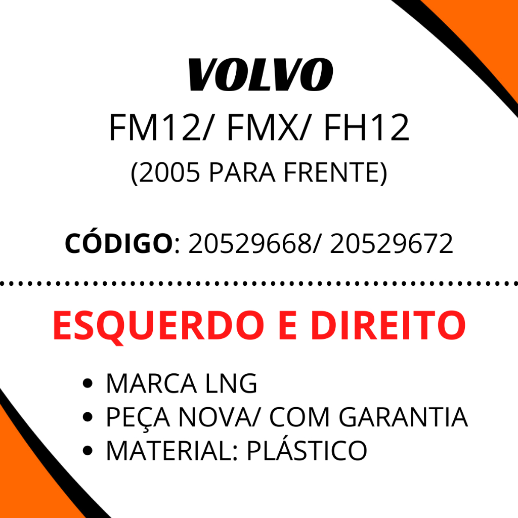 Se você busca qualidade, proteção e um visual renovado para o seu caminhão, o Par de Acabamento de Retrovisor é a escolha ideal para os modelos Volvo FH12, Volvo FM12 e Volvo FMX (a partir de 2005). Desenvolvido sob medida para esses veículos, o produto garante encaixe perfeito e acabamento de alto padrão, valorizando a estética do caminhão e mantendo o visual sempre profissional. Além do design sofisticado, o acabamento atua como uma proteção essencial, ajudando a preservar os componentes internos do retrovisor contra sujeira, umidade e desgastes do dia a dia, o que contribui diretamente para a maior durabilidade do conjunto. Ideal para reposição, manutenção ou renovação estética, é uma solução prática e eficiente para quem não abre mão de qualidade e custo-benefício. ✅ Especificações do Produto Produto: Par de acabamento de retrovisor Quantidade: 2 unidades Código LNG: 60-385 / 60-386 🚛 Compatibilidade >Volvo FH12 >Volvo FM12 >Volvo FMX Ano: 2005 em diante Códigos Originais: 20529672 / 20529668 🛡️ Garantia Garantia de 6 meses contra defeitos de fabricação, mediante análise do departamento técnico. ⚠️ Importante: Danos causados por mau uso ou instalação incorreta não são cobertos pela garantia. Para melhor desempenho e segurança, recomenda-se a instalação por um profissional especializado.