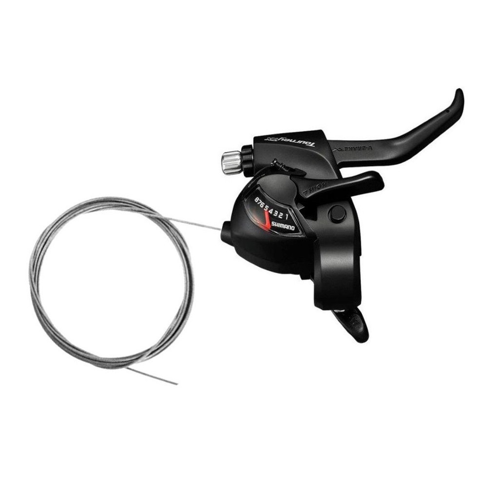 PAR ALAVANCA CÂMBIO/FREIO SHIMANO TOURNEY TX ST-TX800 EZ FIRE V-BRAKE OU DISCO MECÂNICO - 3X8V Itens que compõe o anúncio: 01 und - ALAVANCA CÂMBIO/FREIO SHIMANO TOURNEY TX ST-TX800 V-BRAKE OU DISCO MECÂNICO DIANTEIRO ESQUERDO - 3V; 01 und - ALAVANCA CÂMBIO/FREIO SHIMANO TOURNEY TX ST-TX800 V-BRAKE OU DISCO MECÂNICO TRASEIRO DIREITO - 8V. ** Manete de freio em PLÁSTICO. Especificações: - Marca: SHIMANO; - Linha: TOURNEY TX; - Modelo: TOURNEY ST-TX800; - Lado: Direito + Esquerdo; - Sistema: EZ FIRE PLUS; - Compatível com: relações de 3x8 velocidades e sistema de freio mecânico por cabo de aço (V-Brake ou Disco Mecânico); - Indicado para relação 3x8v; - Possui indicador de posição de Marcha (display) - Fixação: Abraçadeira; - Manete de freio: 2 dedos; - Ajuste de distância entre a manopla e o manete: SIM; - Compatível com todos os freios MECÂNICO – V-BRAKE ou DISCO; - Acompanha: Alavanca DIREITA p/ 8 VELOCIDADES, cabo de câmbio Shimano em aço, Manete de freio mecânico + Alavanca ESQUERDA p/ 3 COROAS, cabo de câmbio Shimano em aço, Manete de freio mecânico – NÃO ACOMPANHA CABO DE FREIO; - Material: Aço e Plástico; - Cor: Preto; - Peso: 265g / CADA; - Origem: Indonésia; - Part Number: Esquerda - ASTTX800LBL, Direita - ASTTX800R8AL. Observação: - Não acompanha cabo de freio / conduite para instalação do sistema de freio; - Produto original SHIMANO e acompanha nota fiscal. Aguardamos o seu pedido! INDIAN BIKE SHOP