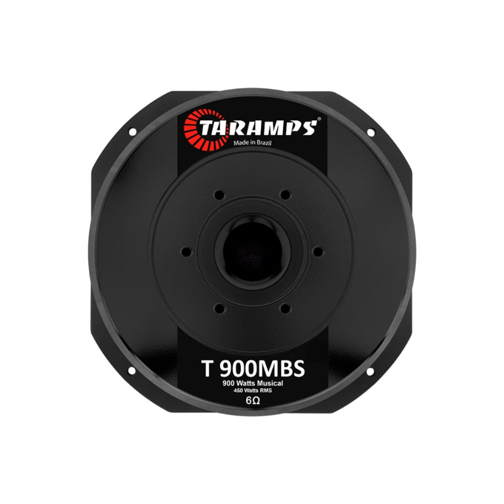 O T 900 MBS é um Mid Bass projetado cuidadosamente para proporcionar alta definição e pressão sonora desde os médio graves até os médio agudos. Disponível na versão 10 polegadas e impedância 6 Ohms, ele é capaz de suportar até 900 Watts em programa musical, atendendo aos mais variados projetos de som automotivo e de uso profissional. Dentre as muitas possibilidades, podemos destacar o uso em caixas “cornetadas”, aplicação na qual apresenta excelente rendimento. Viva uma nova experiência sonora com os alto-falantes Taramps! Informações técnicas • Potência RMS (CADA): 450W • Potência RMS (PAR)): 900W • Impedância Nominal: 6 Ohms • Sensibilidade(@ 1W, 1m)-Free-Air: 96,811dB • Densidade do fluxo no gap: 15.500 GAUSS • Resposta de frequência: 80Hz a 5.500Hz • Material do fio da bobina: CCAW • Forma da bobina: Fibra • Material do ferrite: Bário • Massa diafragma (mmd): 33,648g • Diâmetro da bobina: 3 polegadas • Frequência de ressonância: 77,124Hz • Área efetiva do cone (sd): 0,0356 Sq.m • Diâmetro nominal: 10 Polegadas • Peso: 9,86Kg