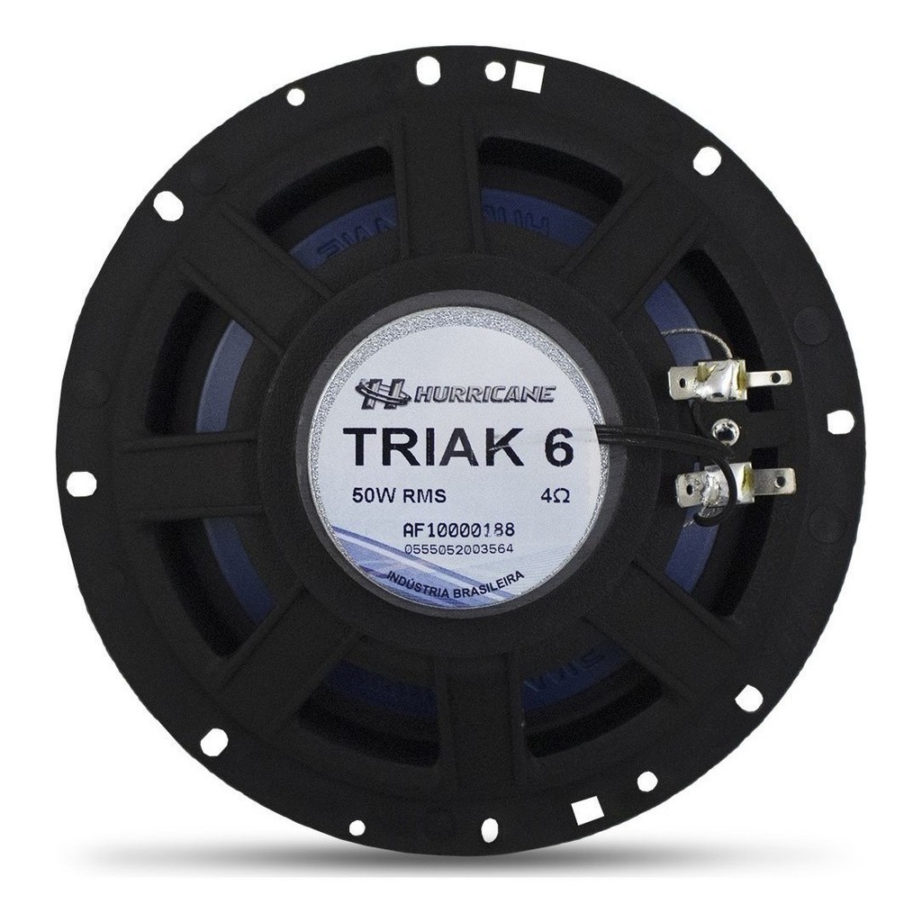 Características: - Marca: Hurricane - Modelo: TRIAK6 Especificações: - Cor: Azul - Tamanho: 6 Polegadas - Impedância: 4 ohms - Potência 100 RMS (par) - Potência 50 RMS (cada) - Quantidade de Vias Triaxial - SPL (1W/1M) 86 dB - Frequência: 80-22KHz - Carcaça Injetada - Cone PP - Borda de borracha - Tweeters Piezo