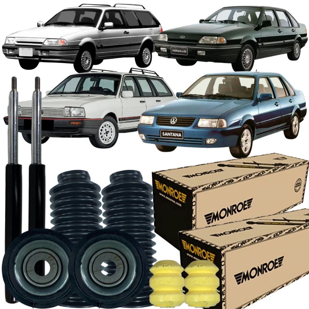 Este anúncio contem os seguintes produtos: O Kit Contem: 01 (um) Amortecedor Dianteiro Esquerdo Original Monroe; 01 (um) Amortecedor Dianteiro Direito Original Monroe; 02 (dois) Suporte/Coxim Dianteiro; 02 (dois) Batente Dianteiro; 02 (dois) Coifa Dianteira; 02 (dois) Rolamento Dianteiro; Garantia: 02 anos de garantia para amortecedores e 3 meses para demais itens; Aplicação dos Veículos: Marca: Ford; Veículo: Royale; Motor: 1.8 8v, 2.0 8v; Posição: Dianteiro; Ano Inicial: 1992, 1993, 1994, 1995, 1996, 1997; Marca: Ford; Veículo: Versailles; Motor: 1.8 8v, 2.0 8v; Posição: Dianteiro; Ano Inicial: 1992, 1993, 1994, 1995, 1996, 1997; Marca: Vw; Veículo: Quantum; Motor: 1.8 8v, 2.0 8v; Posição: Dianteiro; Ano Inicial: 1985, 1986, 1987, 1988, 1989, 1990; Marca: Vw; Veículo: Santana; Motor: 1.8 8v, 2.0 8v; Posição: Dianteiro; Ano Inicial: 1984, 1985, 1986, 1987, 1988, 1989, 1990, 1991, 1992, 1993, 1994, 1995, 1996, 1997, 1998, 1999, 2000, 2001, 2002, 2003, 2004, 2005, 2006; Dúvidas frequentes: O Produto é novo? Sim, nós trabalhamos apenas com produtos novos e originais com garantia e nota fiscal. O Produto é original? Sim, nós só trabalhamos com distribuidores representados pelos fabricante, ou compramos diretamente dos fabricantes, gerando confiança da originalidade do produto. Tem garantia? Sim, todos nossos produtos têm 3 Meses (90 dias) de garantia contra defeitos de fabricação, exceto os amortecedores que possuem 2 anos de garantia total. O produto é igual ao da foto? Sim. Todas as fotos são fiéis ao que você irá receber, e para facilitar a sua compra ilustramos também o veículo em que se aplica o produto. Em quanto tempo recebo minha compra? É muito simples, basta colocar seu CEP no calculador de frete do anuncio. Como faço para saber se o produto deste anúncio se aplica ao meu veículo? Você pode conferir se o produto se aplica no seu carro através da descrição do anúncio no item: “Aplicação dos Veículos”. Caso tenha alguma dúvida, entre em contato com nossa equipe e os profissionais qualificados irão te orientar em qualquer dúvida, estamos sempre a disposição. Tem alguma dúvida sobre o produto ou sobre a compra? Deixe sua pergunta abaixo, que responderemos prontamente. O que é: O amortecedor é uma peça muito importante para o carro e que tem, inclusive, relação com segurança do veículo, já que ela é o principal item do sistema de suspensão — um dos componentes de maior importância nos automóveis. Como citamos, a suspensão é um dos componentes mais importantes do carro. Uma de suas partes fundamentais é o amortecedor. Peça que é responsável por amortecer os impactos entre o carro e o piso e que, também, é fundamental para a segurança, frenagem e estabilidade do veículo, principalmente em curvas. Contar com um amortecedor confiável é fundamental, sendo que essa peça é conhecida como um dos itens do “Triângulo da Segurança”, com o pneu e freio — componentes que de maneira imprescindível precisam estar em perfeito estado para garantir a segurança do veículo. Sobre os Fabricantes: Seja bem-vindo à AutoProParts, sua fonte confiável de peças automotivas de alta qualidade! Somos uma empresa apaixonada por carros e comprometida em fornecer soluções duráveis e eficientes para todas as suas necessidades de reposição e manutenção veicular. Com uma ampla variedade de peças e acessórios disponíveis, garantimos a excelência em qualidade, desempenho e segurança. Nossa equipe especializada está pronta para ajudá-lo a encontrar exatamente o que você precisa, seja para reparos ou aprimoramentos. Confie na AutoProParts para garantir o máximo desempenho e confiabilidade ao seu veículo. Fundado em 1916 na cidade de Monroe, estado de Michigan, pelo mecânico e empresário August F. Meyer, o negócio que acabou por se tornar a Monroe Auto Equipment Company inicialmente fabricava bombas de pneus para os proprietários dos primeiros automóveis. Logo Meyer acrescentou um sócio, um revendedor local de carros Dodge, Charles S. McIntyre, cujo conhecimento da indústria ajudou a incrementar a demanda pelas bombas da empresa, que eram autolubrificantes e de cano único. Em 1926, Meyer e McIntyre já haviam dirigido sua atenção para uma oportunidade maior: a demanda dos motoristas por maior conforto e controle. Mais tarde, nesse mesmo ano, Meyer e McIntyre introduziram o primeiro "Eliminador de Choques" da Monroe, que logo substituiu as toscas molas dos automóveis de passageiros da época. Nove décadas e milhões de clientes depois, a marca Monroe se tornou uma norma globalmente reconhecida de inovação e excelência de produtos dentro da categoria de ride control.